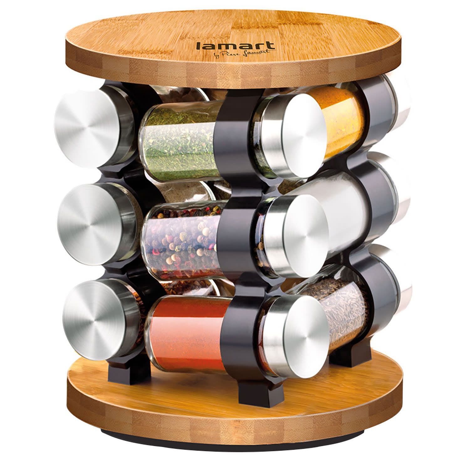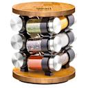 Αυτό το σετ αποτελείται από 12 δοχεία μπαχαρικών, τα οποία είναι τοποθετημένα σε ξύλινη περιστρεφόμενη βάση από bamboo, για να βρίσκεις εύκολα εκείνα που χρειάζεσαι για τις συνταγές σου. Είναι κατασκευασμένα από ανθεκτικό γυαλί, ώστε να μπορείς να τα πλένεις στο πλυντήριο πιάτων, εφόσον πρώτα αφαιρέσεις το καπάκι!