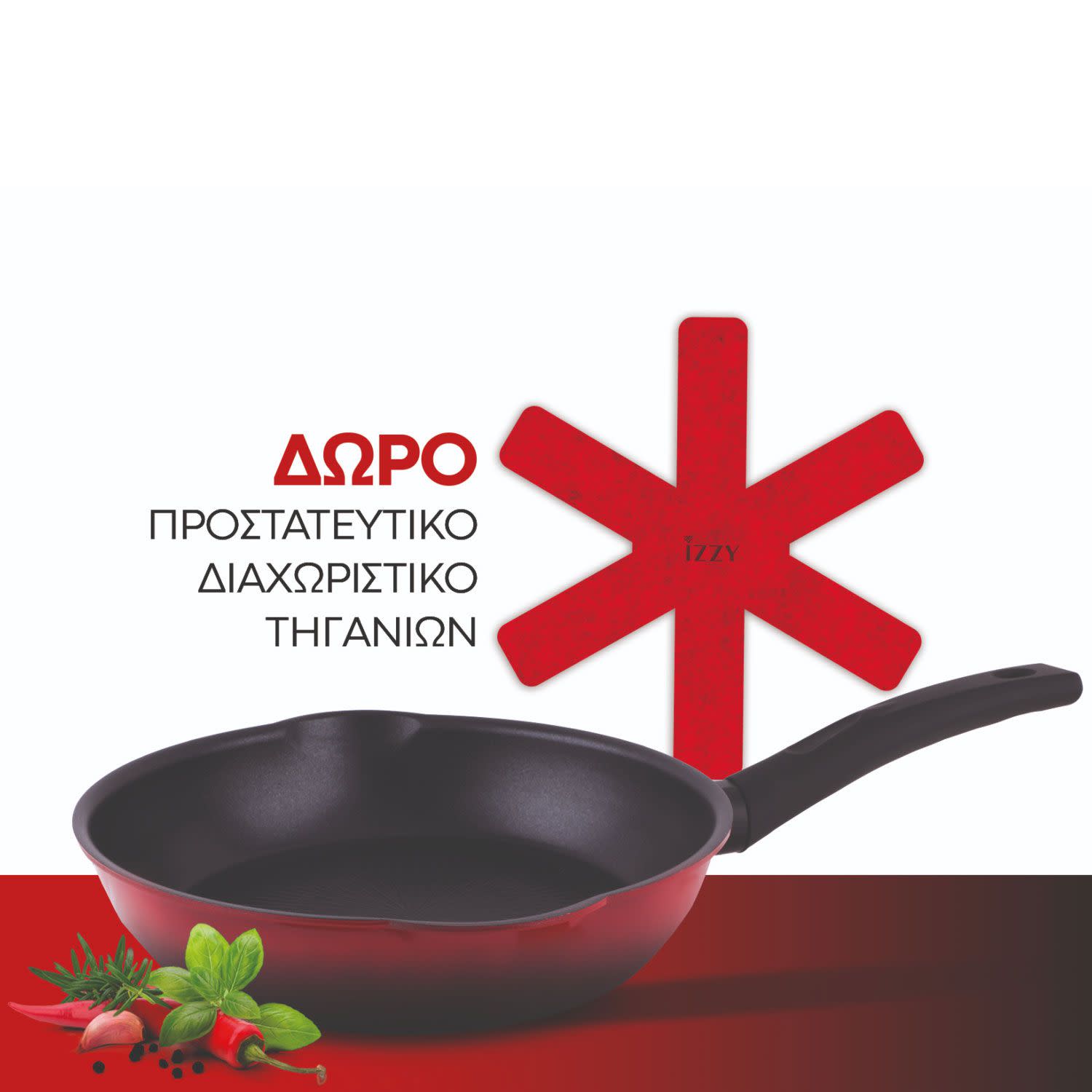 Το αντικολλητικό τηγάνι της Izzy διαθέτει δώρο ένα κόκκινο προστατευτικό, δαχωριστικό τηγανιού, για μεγαλύτερη άνεση και ευελιξία στις μαγειρικές σου... αποστολές!