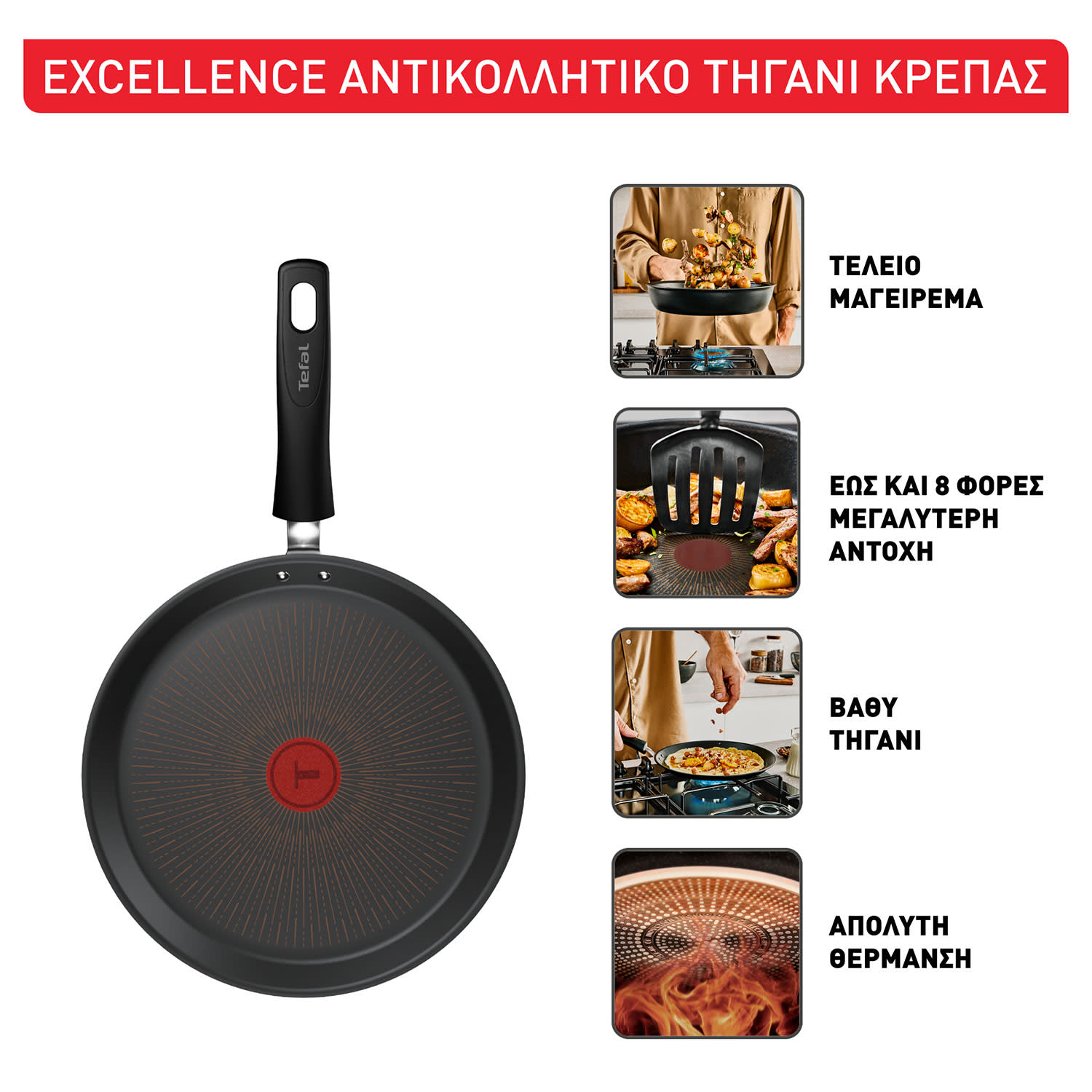 Απογείωσε τον μαγειρικό σου εξοπλισμό και ετοίμασε νόστιμα πιάτα και λαχταριστές κρέπες για όλους, εύκολα και γρήγορα. Το σύγχρονο, τηγάνι-κρεπιέρα 25cm, από την σειρά Excellence της Tefal, εγγυάται εξαιρετικό μαγείρεμα και αντοχή διαρκείας, σύμφωνα πάντα με τα υψηλότερα πρότυπα.