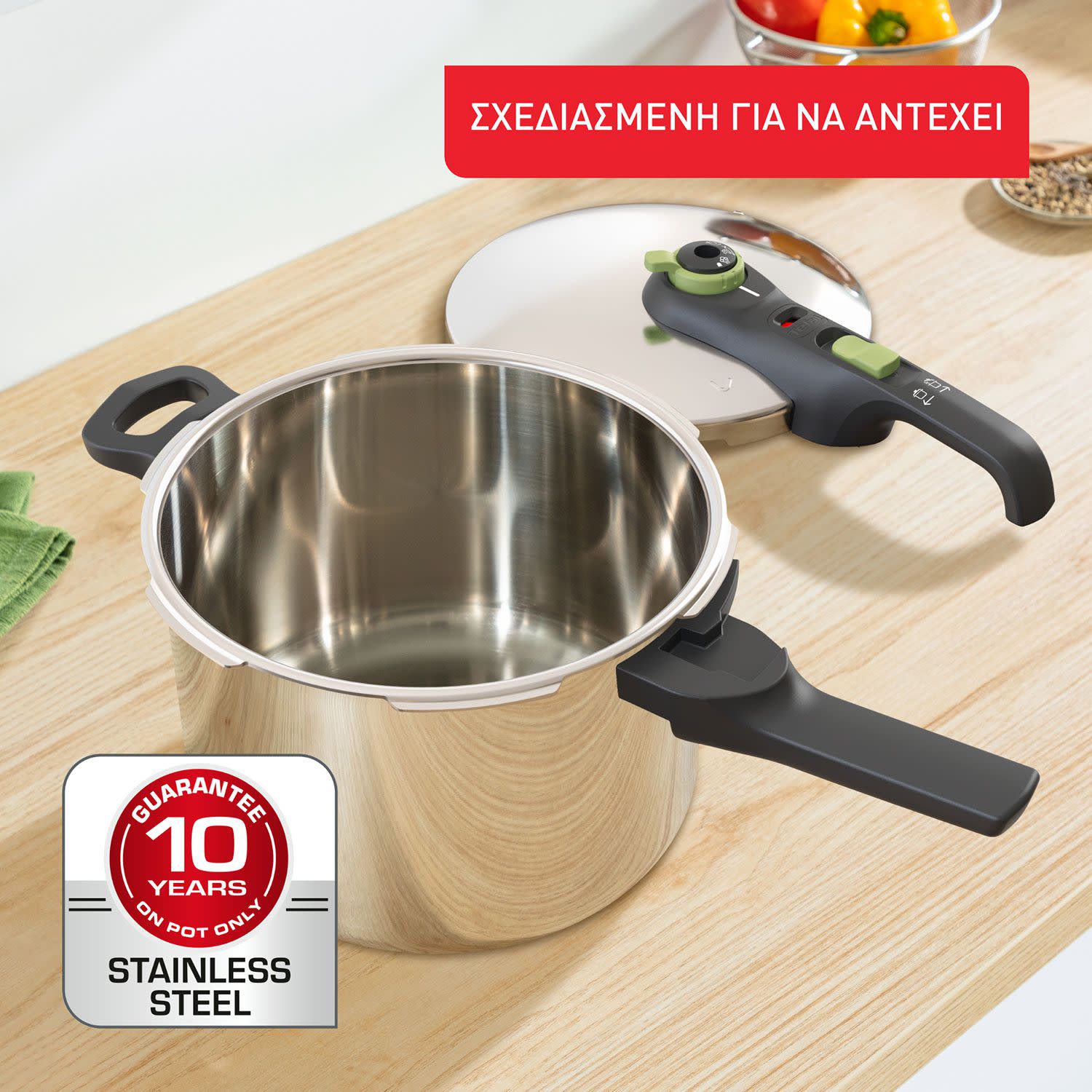 Χύτρα ταχύτητας της Tefal από ανοξείδωτο ατσάλι και χωρητικότητα 6Lt. Είναι κατάλληλη για όλες τις εστίες, ενώ διαθέτει 2 προγράμματα μαγειρέματος και σύστημα ασφαλείας 5 σημείων, για μέγιστη άνεση.