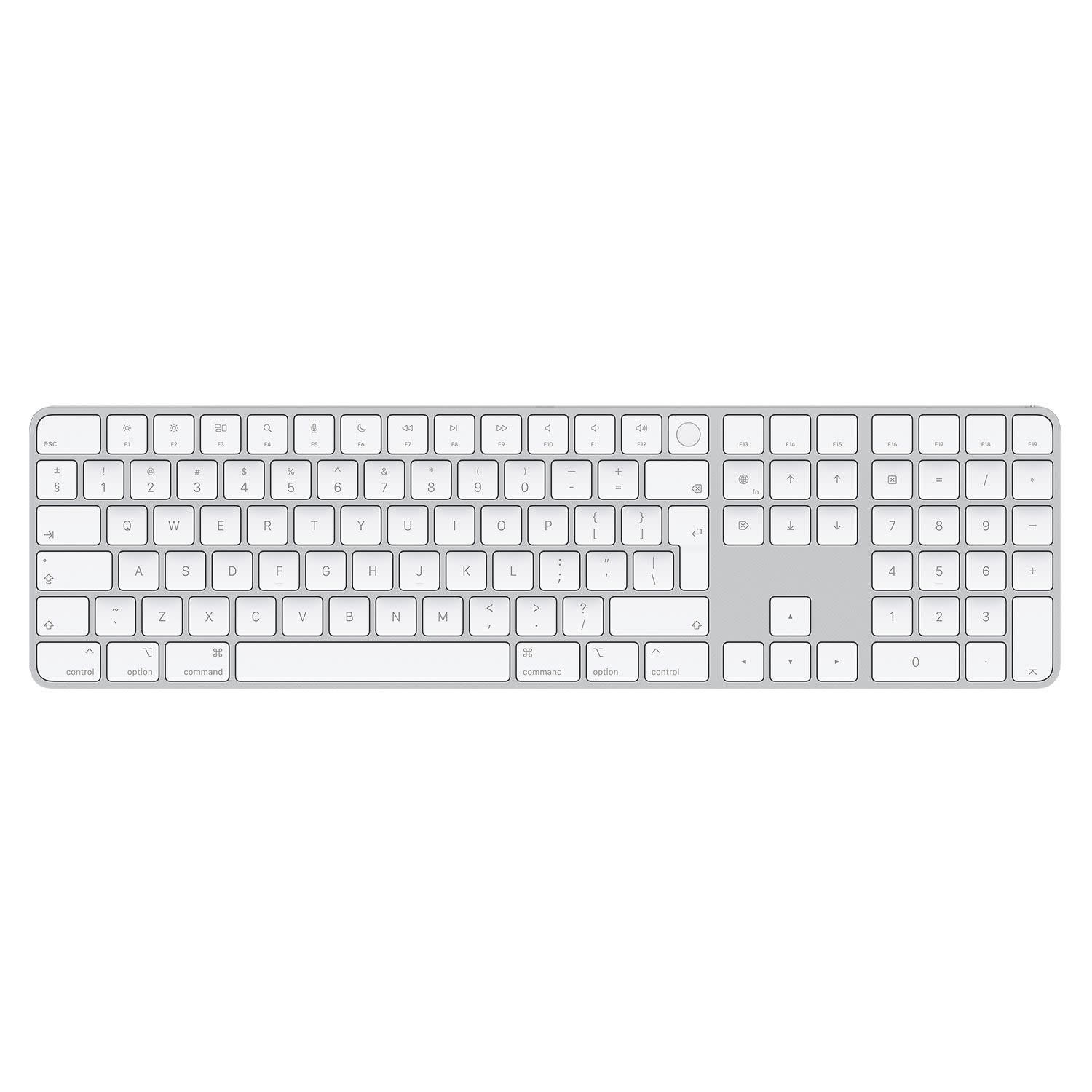 Το Magic Keyboard είναι τώρα διαθέσιμο με Touch ID, ώστε να σου προσφέρει γρήγορο, εύκολο και ασφαλή έλεγχο ταυτότητας. Διαθέτει μια εκτεταμένη διάταξη, με στοιχεία ελέγχου πλοήγησης σε έγγραφα για γρήγορη κύλιση και πλήκτρα με βέλη πλήρους μεγέθους, τα οποία είναι ιδανικά για χρήση σε παιχνίδια. Το αριθμητικό πληκτρολόγιο είναι επίσης ιδανικό για υπολογιστικά φύλλα και εφαρμογές οικονομικών. Είναι εξαιρετικά άνετο και ακριβές στη χρήση του, ασύρματο και με δυνατότητα επαναφόρτισης. Η μπαταρία του τροφοδοτεί το πληκτρολόγιό σου για περίπου έναν μήνα ή και περισσότερο μεταξύ των φορτίσεων. Ζευγοποιείται αυτόματα με το Mac σου και περιλαμβάνει ένα πλεκτό καλώδιο USB-C σε Lightning που σου επιτρέπει να κάνεις ζευγοποίηση και φόρτιση, μέσω σύνδεσης με θύρα USB-C.