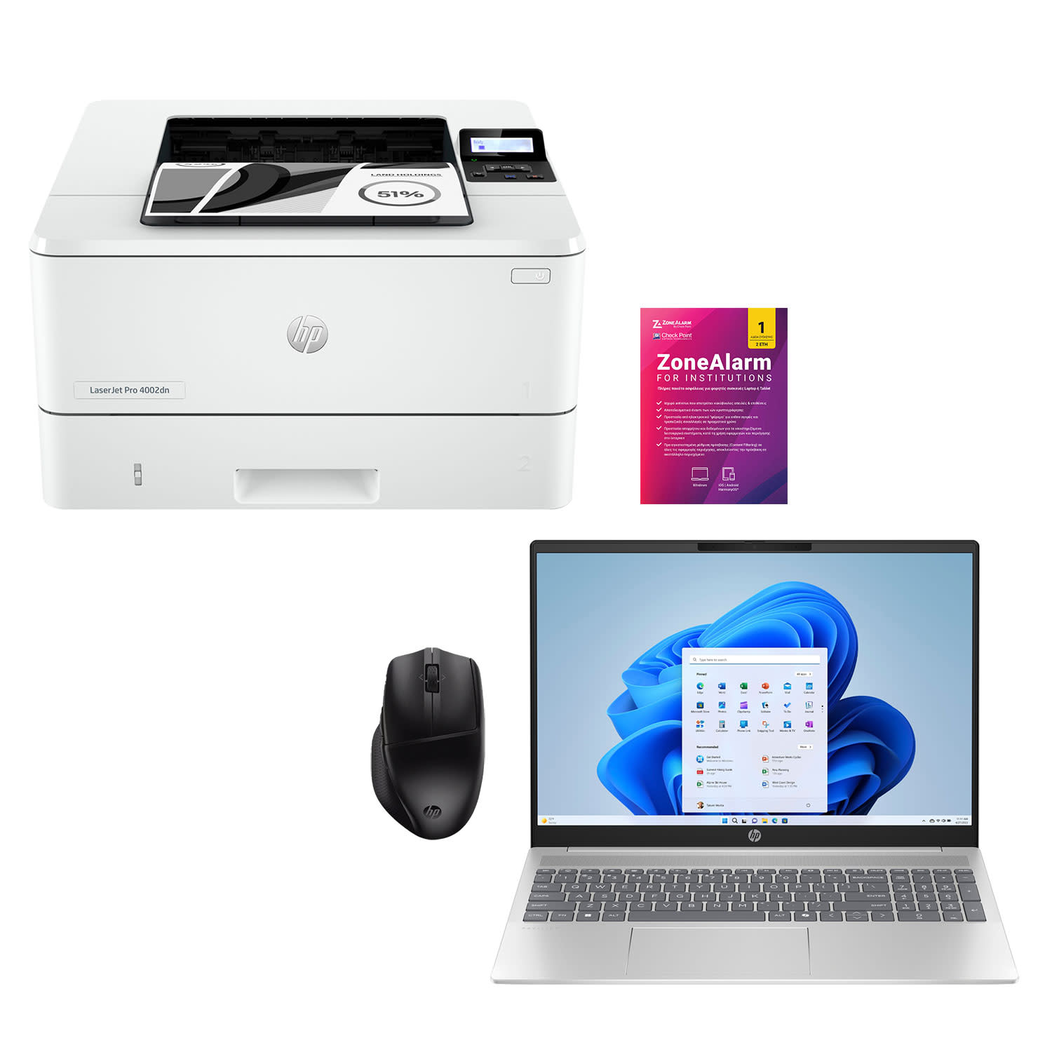 «Πακέτο» με φορητό υπολογιστή HP Pavilion 16-ag0001nv Absolute, εκτυπωτή HP LaserJet Pro 4002dn, ποντίκι Bluetooth® HP 480 Comfort και ZoneAlarm® for Institutions για αυξημένη παραγωγικότητα.