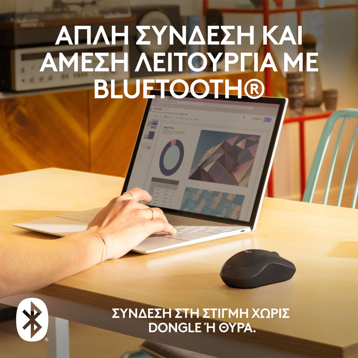 Σύνδεσέ το στη στιγμή, με γρήγορη και εύκολη σύνδεση Bluetooth®, χωρίς dongle ή θύρα. Εξαιρετικά αθόρυβο, με 90% λιγότερο θόρυβο κλικ και την ίδια αίσθηση κλικ, εξαλείφει θορύβους και περισπασμούς για εσένα και τους γύρω σου. Το εργονομικό άνετο σχήμα ακολουθεί τη φυσική καμπύλη του χεριού σου, ώστε να διατηρείς την παραγωγικότητά σου για μεγαλύτερο χρονικό διάστημα.