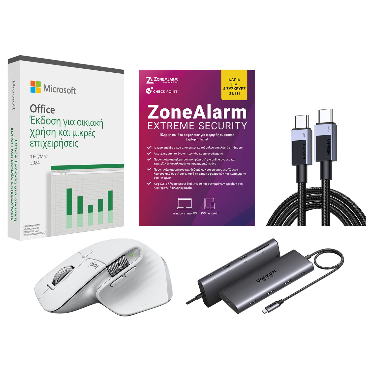 Το καλώδιο φόρτισης USB-C 100W και το Revodok Pro 210 10-in-1 USB-C Hub της UGREEN παρέχουν απρόσκοπτη συνδεσιμότητα και μέγιστη ευελιξία για όλες τις συσκευές σου, ενώ τα Microsoft Office 2024 Home & Business και ZoneAlarm® Extreme Security φροντίζουν να είσαι παραγωγικός και ασφαλής.