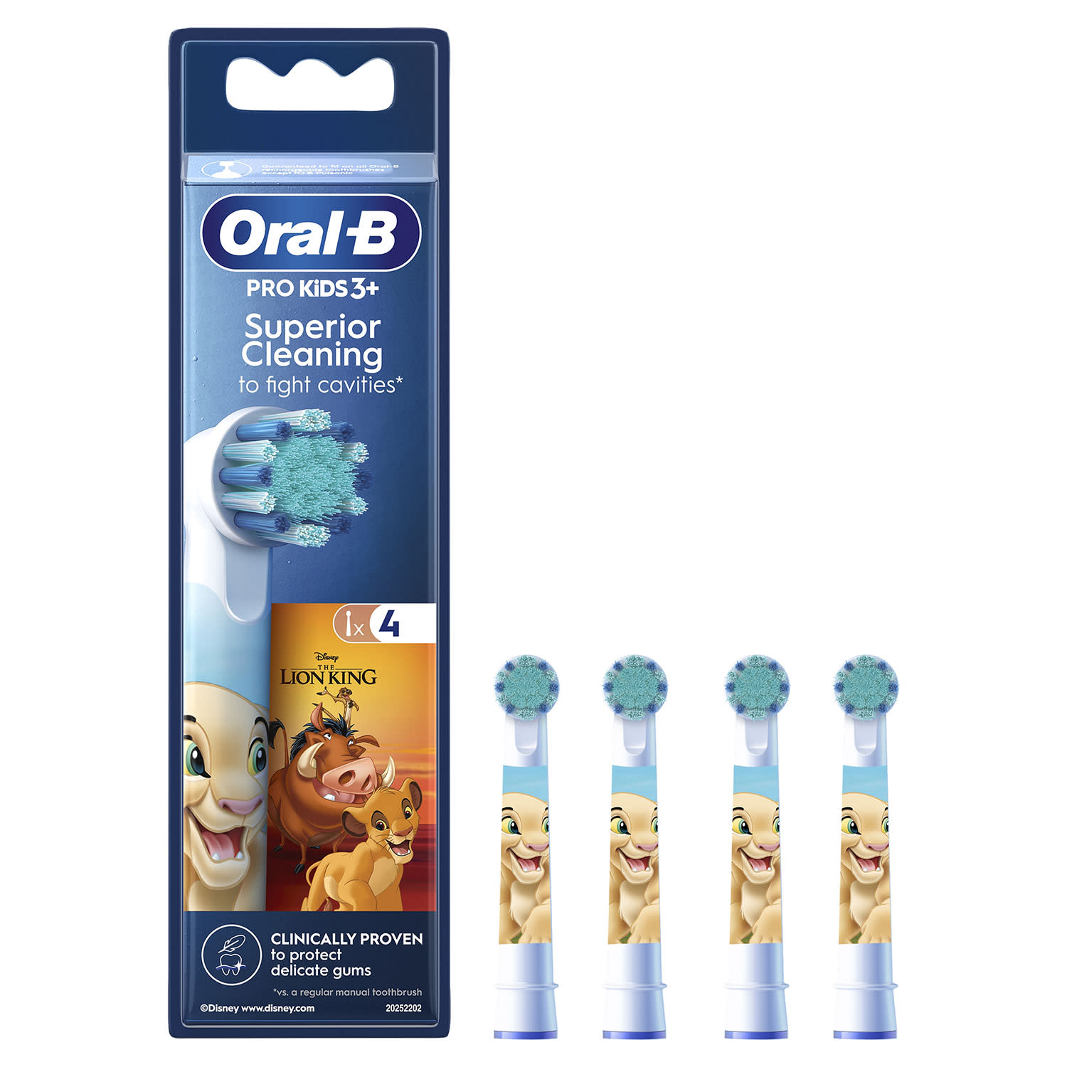 Ανταλλακτικές κεφαλές «Lion King» της Oral-B σε σετ 4 τεμαχίων, ειδικά σχεδιασμένες για τα παιδικά, ευαίσθητα δόντια και ούλα. Με μαλακές ίνες που μετακινούνται απαλά, αποτρέποντας τους τραυματισμούς.