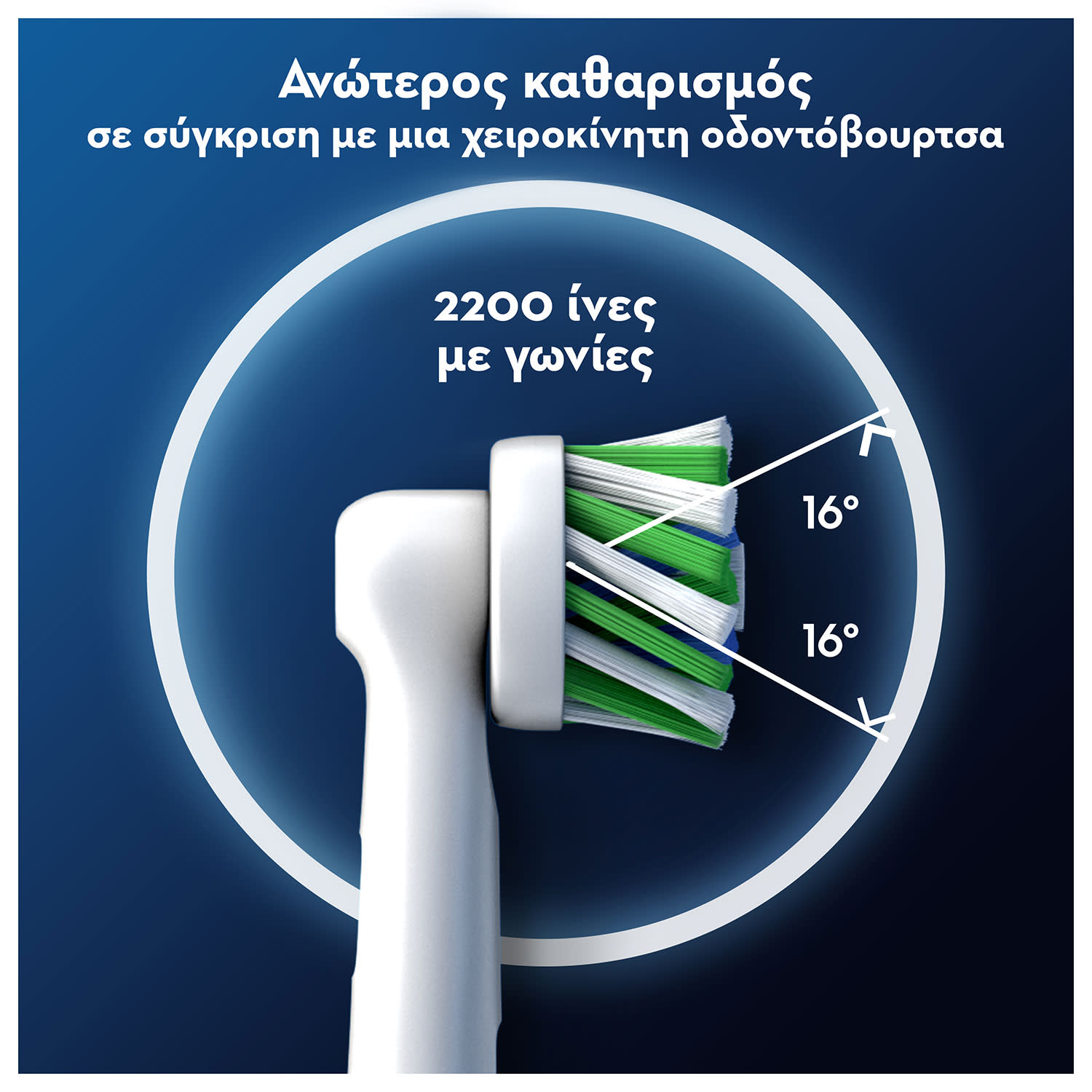 Κάθε κεφαλή βουρτσίσματος Oral-B Pro Cross Action διαθέτει περισσότερες από 2.200 ίνες με τέλεια γωνία 16° που απομακρύνουν έως και 100% περισσότερη βακτηριακή πλάκα, προσφέροντας πιο καθαρά δόντια και πιο υγιή ούλα σε σύγκριση με μια χειροκίνητη οδοντόβουρτσα.