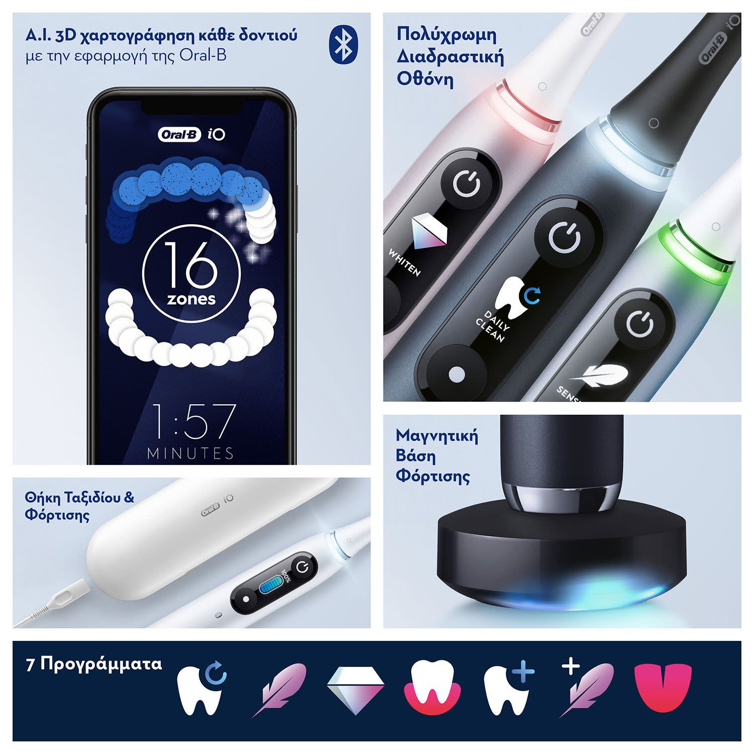 Φρόντισε τα δόντια σου με την επαναφορτιζόμενη οδοντόβουρτσα iO της Oral-B. Έρχεται με 7 διαφορετικά προγράμματα για να καλύψει όλες τις ανάγκες σου, από τις πιο απλές, μέχρι τις πιο σύνθετες. Χρησιμοποίησε την ειδική εφαρμογή της Oral-B που σου προσφέρει χρήσιμες πληροφορίες, οδηγίες και δεδομένα για να έχεις ακόμα καλύτερα αποτελέσματα. Έρχεται με θήκη ταξιδίου με USB για να τη φορτίζεις με ευκολία, όπου και αν βρίσκεσαι.