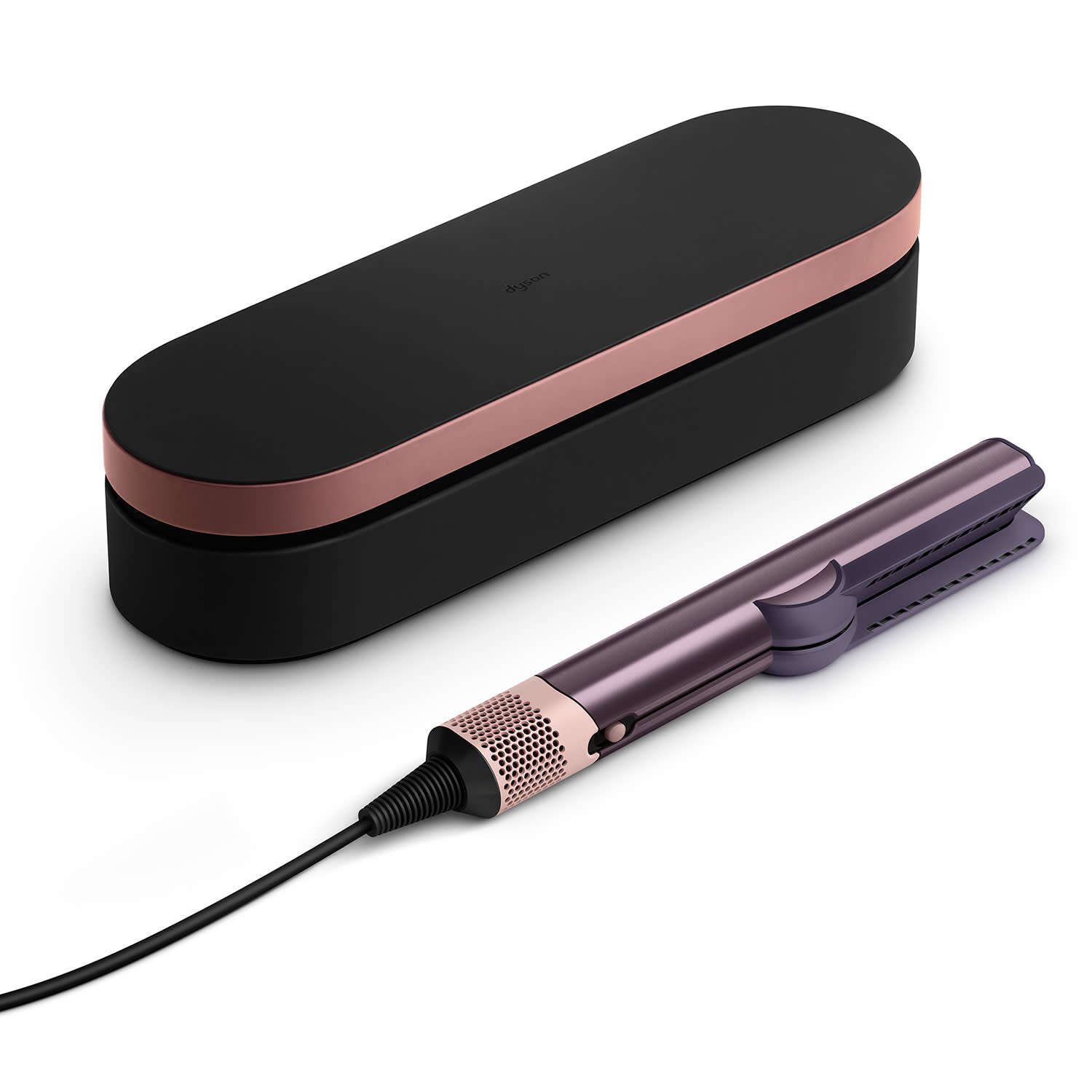 Στη συσκευασία θα βρεις το Dyson Airstrait™ (Jasper plum), Θήκη αποθήκευσης σχεδιασμένη από τη Dyson και μία αντιολισθητική επιφάνεια ανθεκτική στη θερμότητα, για ασφαλή τοποθέτηση κατά τη διάρκεια ή μετά τη χρήση.