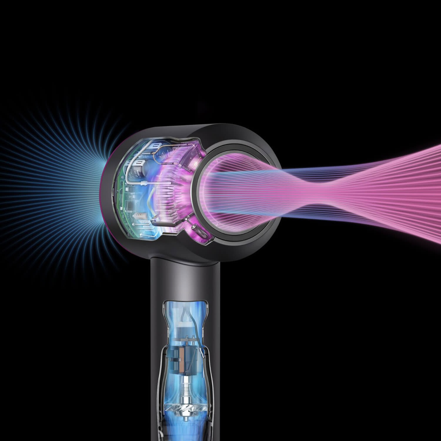 Το μικρό, ισχυρό ψηφιακό μοτέρ Dyson V9 περιστρέφεται έως και 110.000rpm. Σε συνδυασμό με την τεχνολογία Air Multiplier™ παράγει μία ροή ελεγχόμενου αέρα υψηλής πίεσης και υψηλής ταχύτητας, για γρήγορο στέγνωμα και styling ακριβείας.