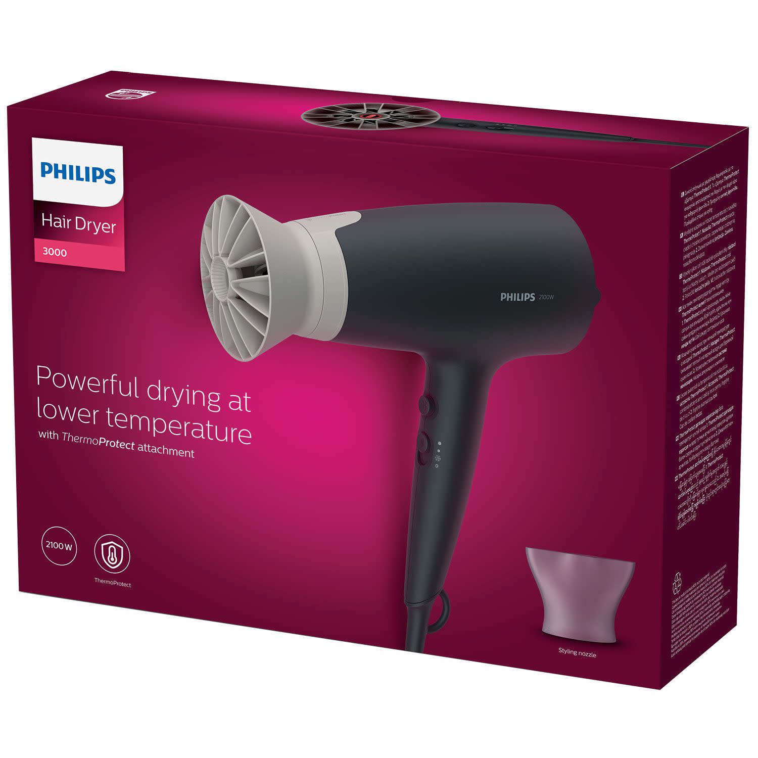 Χάρη στο μοναδικά σχεδιασμένο εξάρτημα ThermoProtect τα μαλλιά σου στεγνώνουν και φορμάρονται στην ιδανική θερμοκρασία, με αποτέλεσμα να προφυλάσσονται από τη φθορά που προκαλεί ο πολύ καυτός αέρας. Η θερμοκρασία μειώνεται κατά 15°C, ενώ τα μαλλιά σου στεγνώνουν και πάλι γρήγορα.