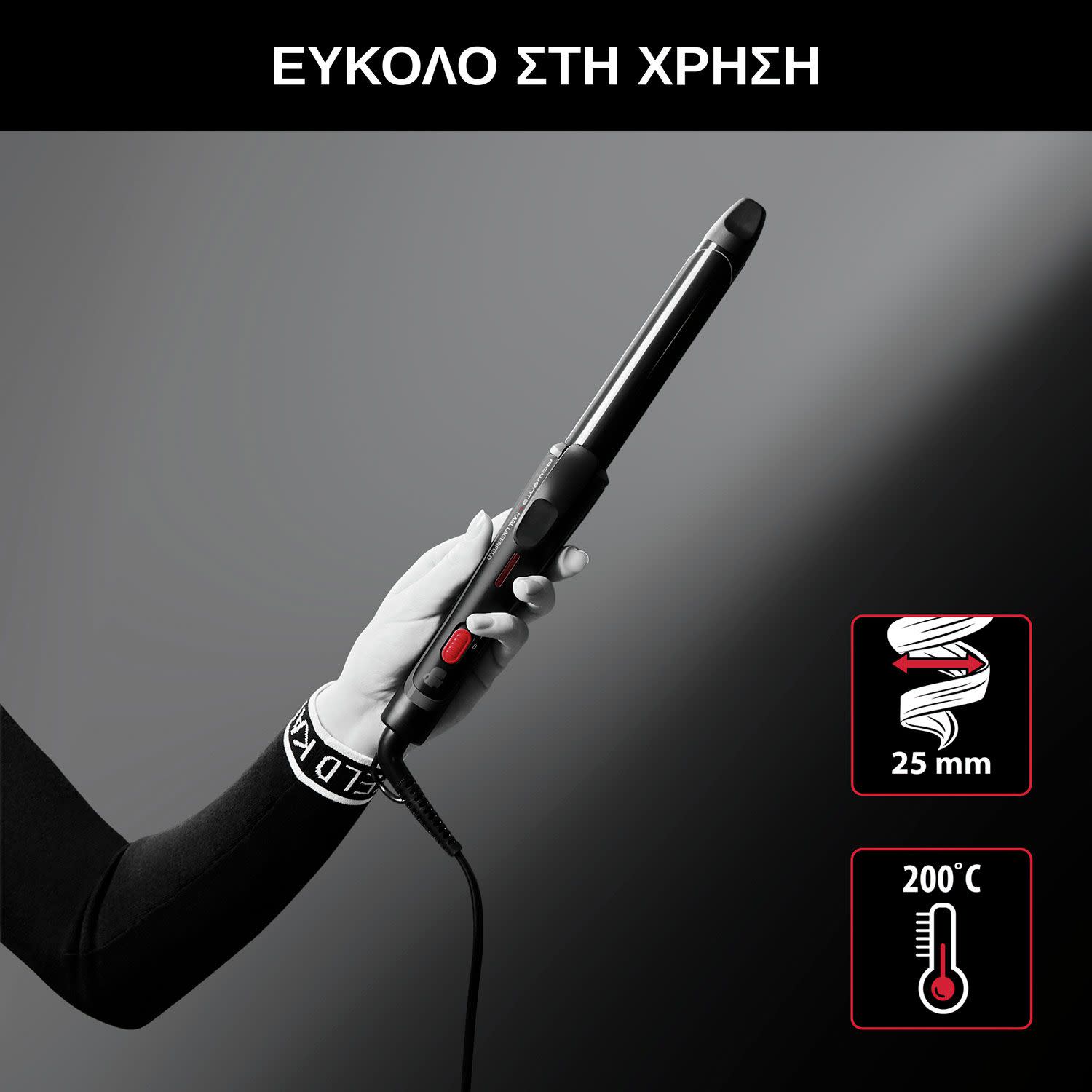Το ψαλίδι για μπούκλες Rowenta x KARL LAGERFELD είναι το μυστικό σου όπλο για φυσικές μπούκλες και ανάλαφρους κυματισμούς, για εξαιρετικά αποτελέσματα κάθε φορά. Αυτό το πρακτικό εργαλείο styling διαθέτει την αποκλειστική επίστρωση Keratin & Glow, η οποία συνδυάζει την πρωτεΐνη κερατίνη με την τουρμαλίνη, για τη μείωση του στατικού ηλεκτρισμού και του φριζαρίσματος, κάνοντας τα μαλλιά σου απαλά, μεταξένια και ενισχυμένα με εκτυφλωτική λάμψη. Η σταθερή θερμοκρασία των 200°C χαρίζει τέλεια αποτελέσματα στη στιγμή, με μεγάλη ποικιλία βελτιωμένων χαρακτηριστικών για ολοκληρωμένο styling!