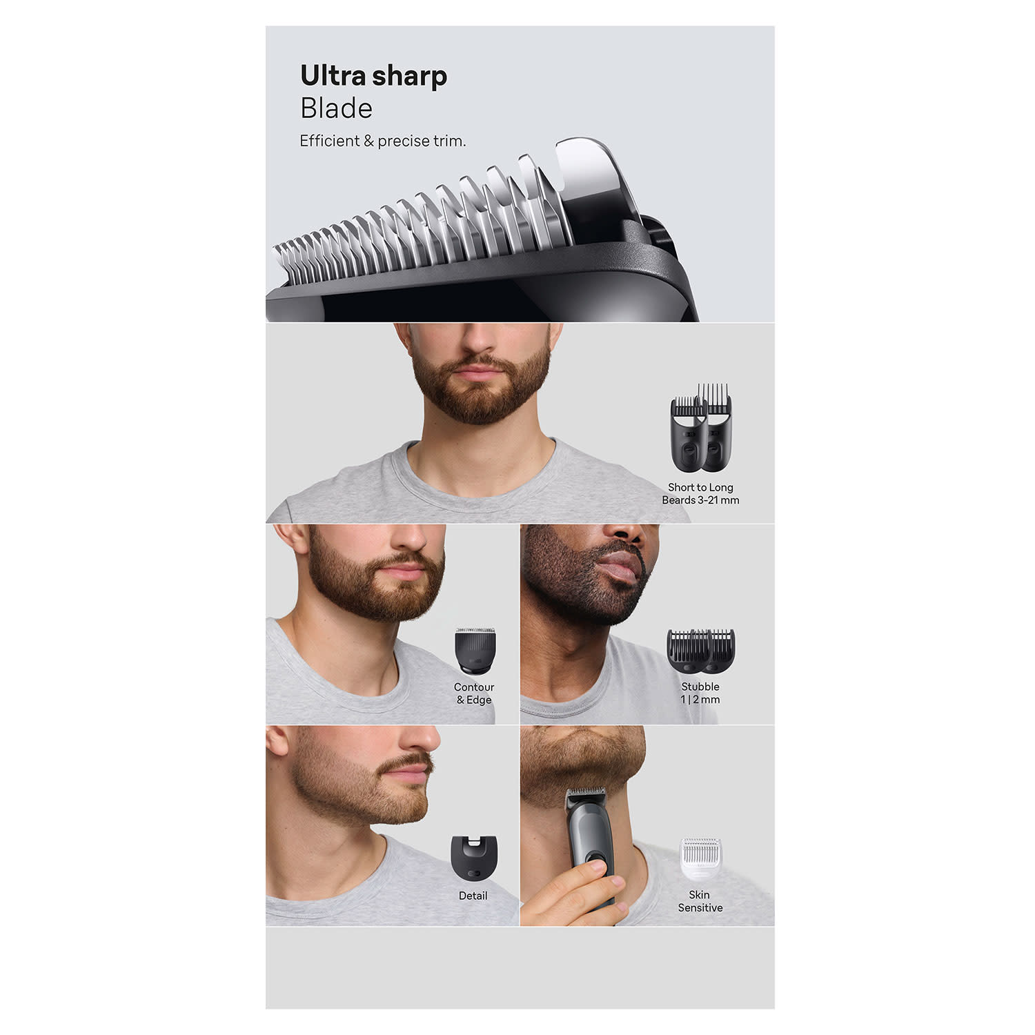 Σετ Ανδρικής Περιποίησης από τη Braun με αυτονομία 50min, πλενόμενες κεφαλές για πανεύκολο καθαρισμό και εξαρτήματα για μέγιστη ακρίβεια κοπής σε μαλλιά, σώμα και γένια.