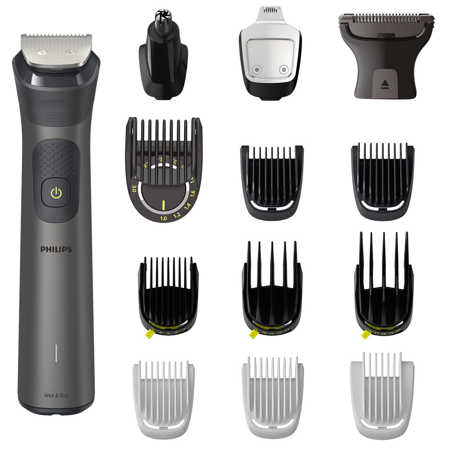 Περιλαμβάνει Τρίμερ από ατσάλι, Εξάρτημα ψαλιδίσματος για μύτη & αυτιά, Ξυριστική σώματος με σύστημα προστασίας του δέρματος, Τρίμερ ακριβείας από ατσάλι, Χτενάκι ακριβείας, Ρυθμιζόμενη χτένα 3-7mm., Ρυθμιζόμενη χτένα 9-13mm., Ρυθμιζόμενη χτένα 16-20mm., 2 χτένες για το σώμα, 2 χτένες για γένια, Πολυτελές νεσεσέρ, Βούρτσα καθαρισμού, USB-A (το τροφοδοτικό δεν περιλαμβάνεται).