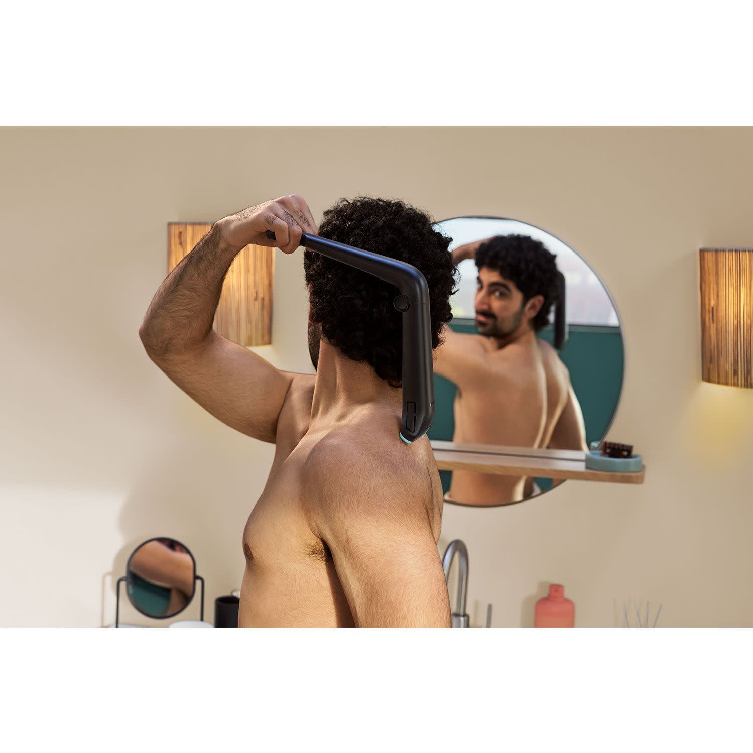 Το νέο αναδιπλούμενο εξάρτημα πλάτης προσφέρει βελτιωμένη εργονομική εμπειρία και βελτιώνει σημαντικά τη προσβασιμότητα σε όλο το σώμα. Η λαβή διαθέτει διάφορες ρυθμίσεις για άνετο ξύρισμα από όλες τις πλευρές.
