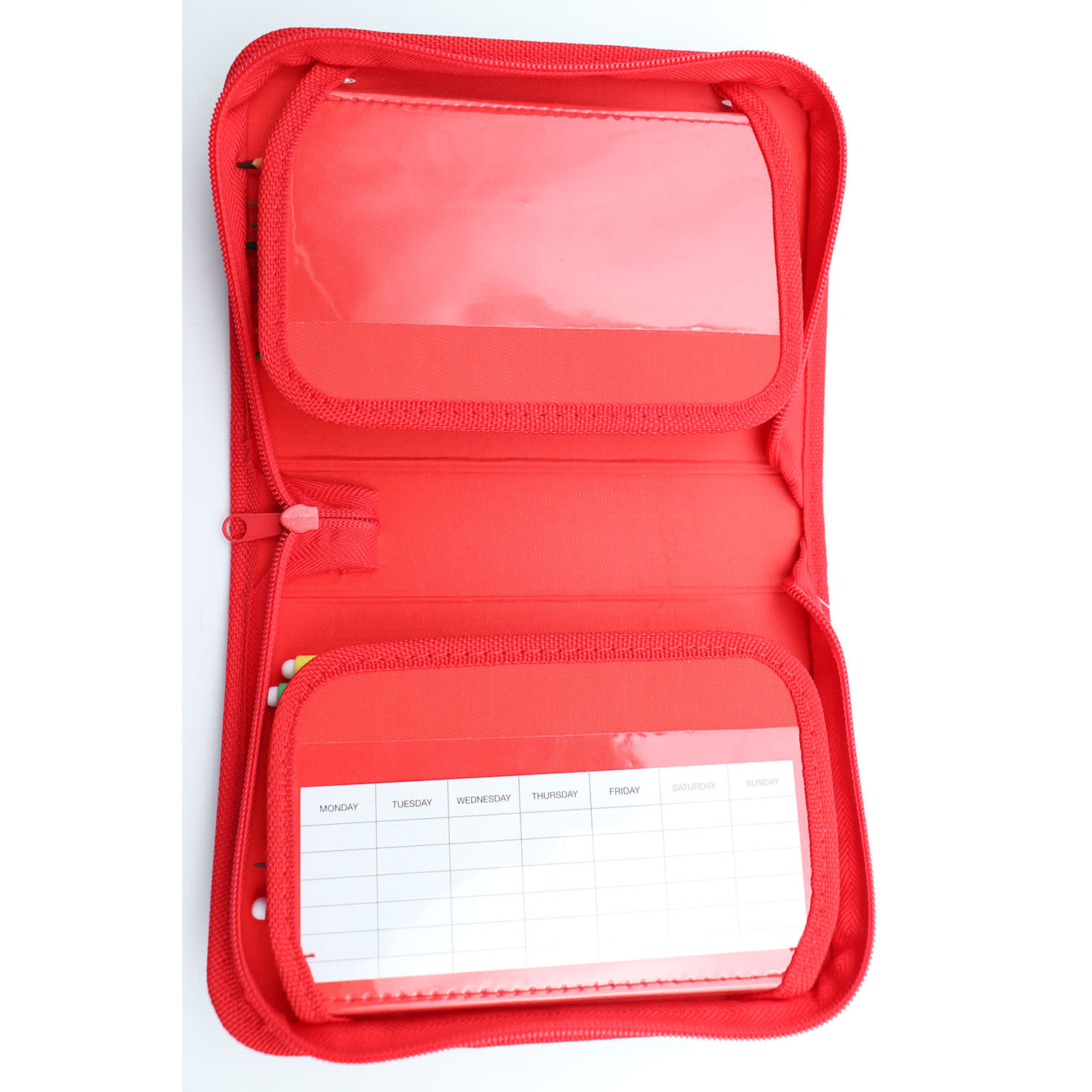 Η κασετίνα έχει 1 θήκη και περιλαμβάνει 8 ξυλομπογιές, 10 μαρκαδόρους, γόμα, ξύστρα, χάρακα, στυλό και 2 μολύβια.