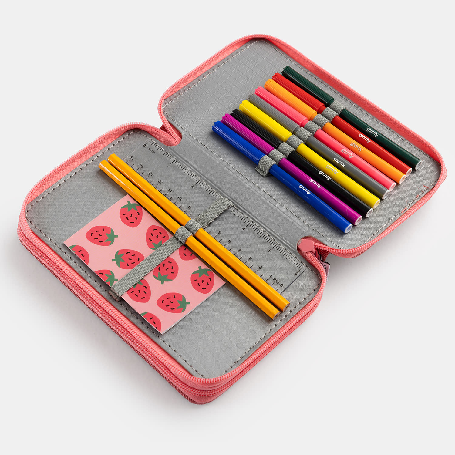 Εξοπλίσου πλήρως για τη νέα σχολική χρονιά με τη γεμάτη κασετίνα «Strawberries» της Goomby. Περιλαμβάνει όλη την απαραίτητη γραφική ύλη που θα χρειαστείς κατά τη διάρκεια μιας σχολικής μέρας και σου δίνει τη δυνατότητα να την μεταφέρεις με ασφάλεια και στιλ, χάρη στο μοναδικό της σχεδιασμό!