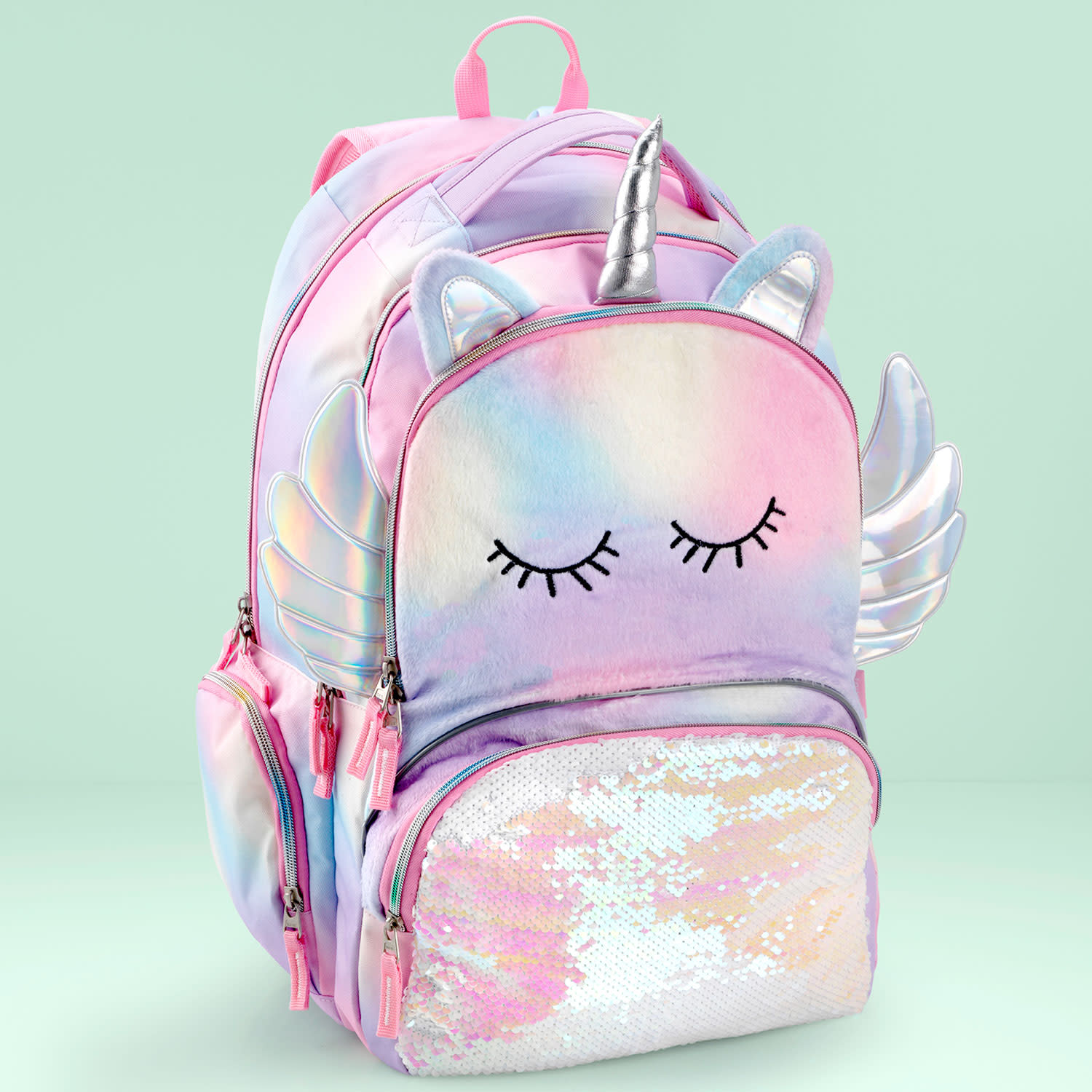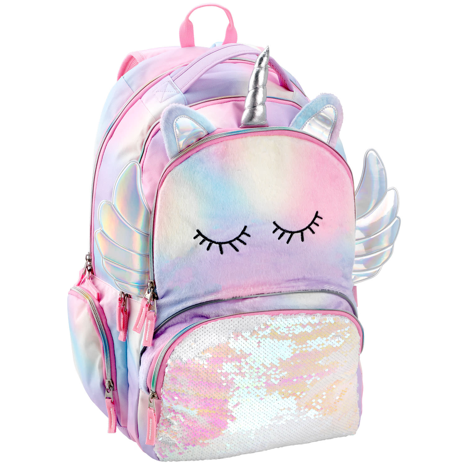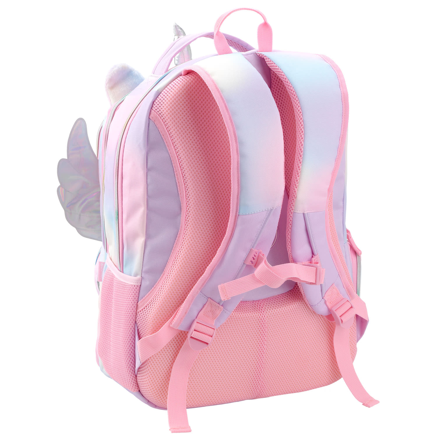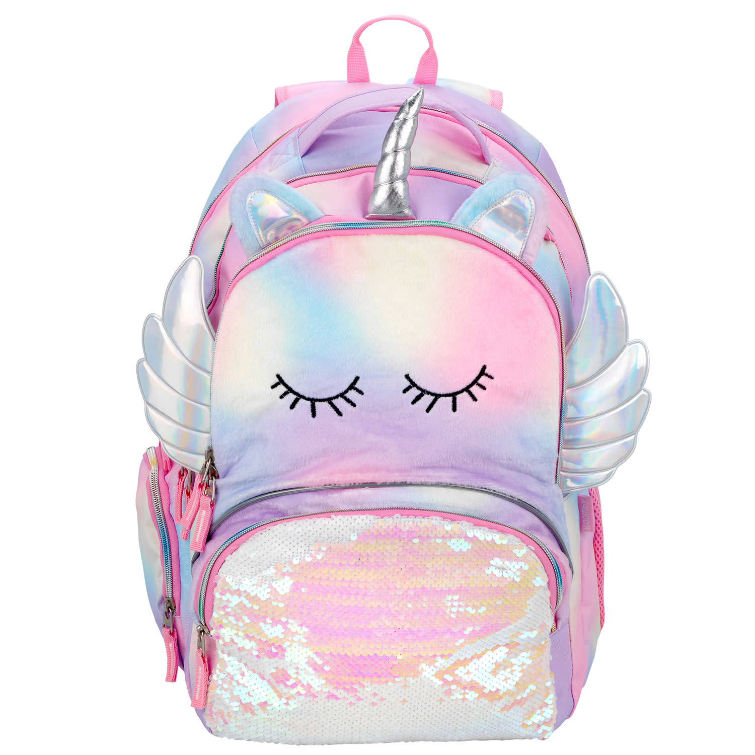 Κάνε τη διαφορά με τη σχολική τσάντα Unique Unicorn Wings μέσα στην τάξη. H 100% συνθετική γούνινη,η πολύχρωμη υφή της, τα 3D στοιχεία της με Holographic λεπτομέρειες και οι πούλιες σε pastel ροζ - λευκή απόχρωση ενώνονται σε μία τσάντα με πολλές, μοναδικές, φανταχτερές λεπτομέρειες, η οποία είναι ανθεκτική στο νερό, διαθέτει SBS φερμουάρ αλλά και 4 θήκες για μεγαλύτερη άνεση. Δύο μεγάλες κεντρικές, η μία με ενίσχυση για μεταφορά laptop και 2 μπροστινές μικρότερες θήκες, η μία με εσωτερικές τσέπες για καλύτερη οργάνωση. Ακόμα, ανατομική αεριζόμενη πλάτη με επιπλέον ενίσχυση, εργονομικοί αεριζόμενοι ιμάντες πλάτης και ιμάντας στήθους, διχτυωτές πλαϊνές θήκες για μεταφορά παγουριού και ενισχυμένο χερούλι μεταφοράς.