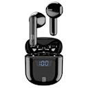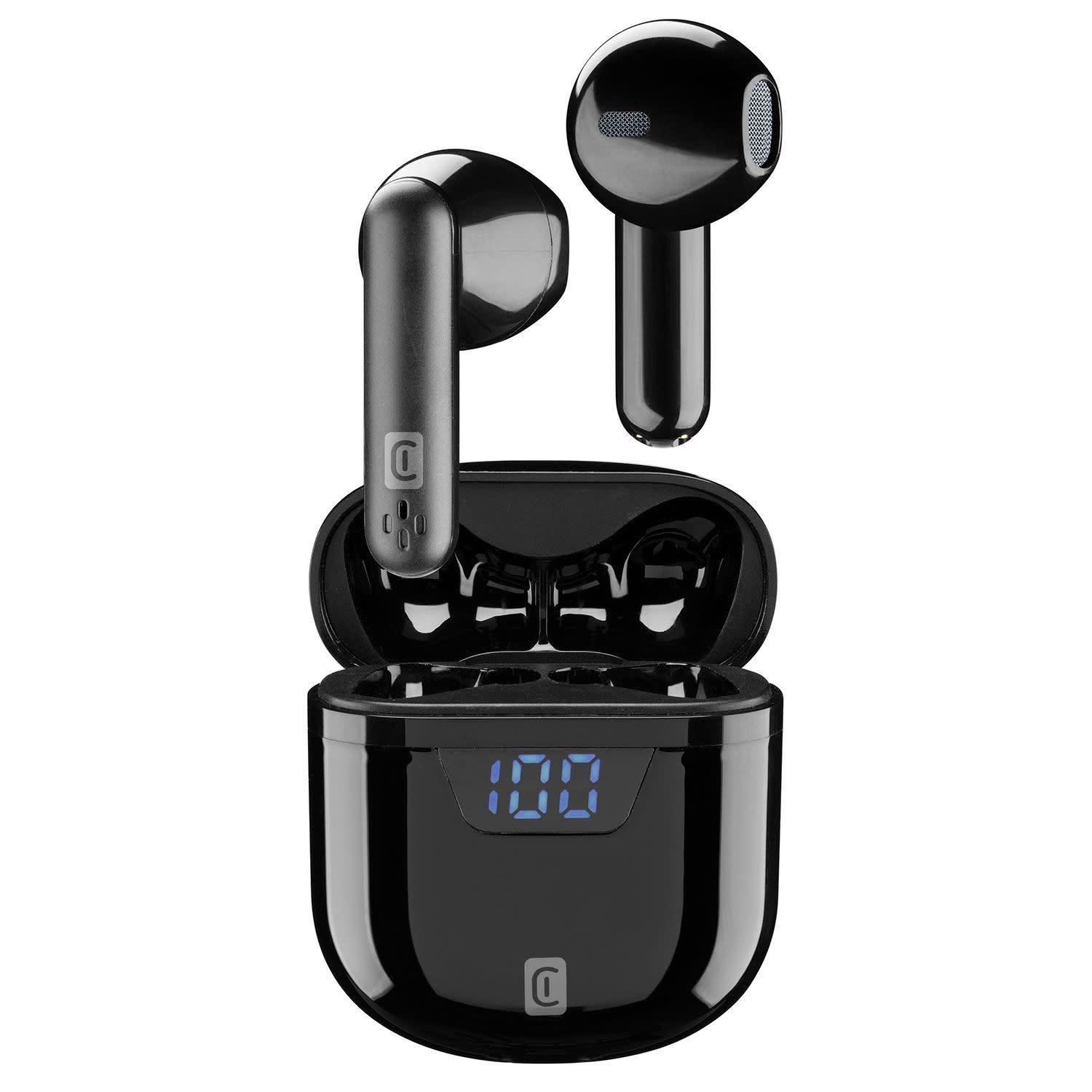 Ασύρματα (TWS) ακουστικά από την Cellularline, με συνδεσιμότητα Bluetooth® και θήκη φόρτισης με οθόνη, η οποία απεικονίζει το επίπεδο φόρτισης της μπαταρίας.