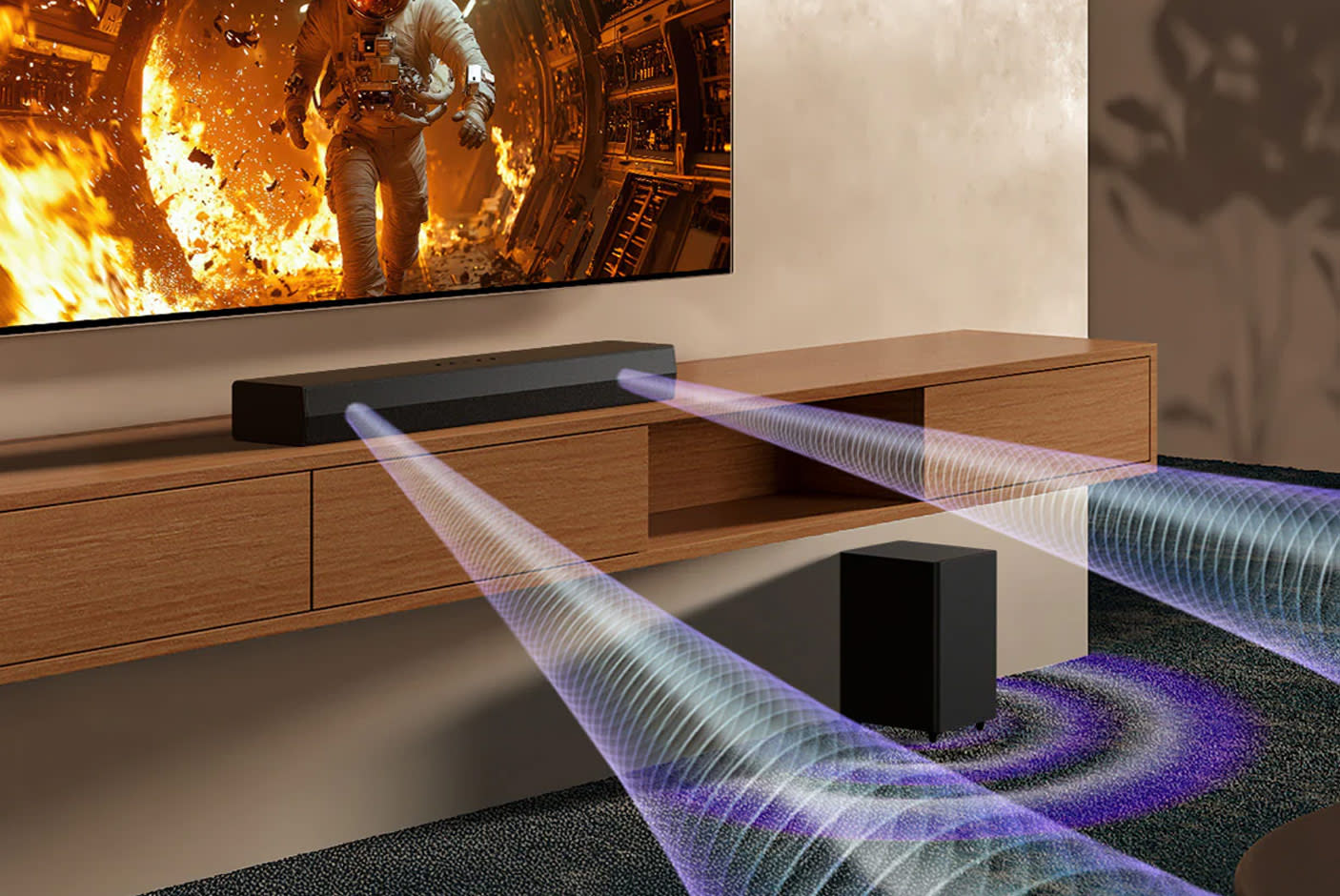 Ζήσε πλούσιο surround ήχο 2.1 καναλιών, όπου το soundbar και η τηλεόραση συνεργάζονται για βελτιωμένη ακουστική κάλυψη και εντυπωσιακή καθαρότητα ήχου.