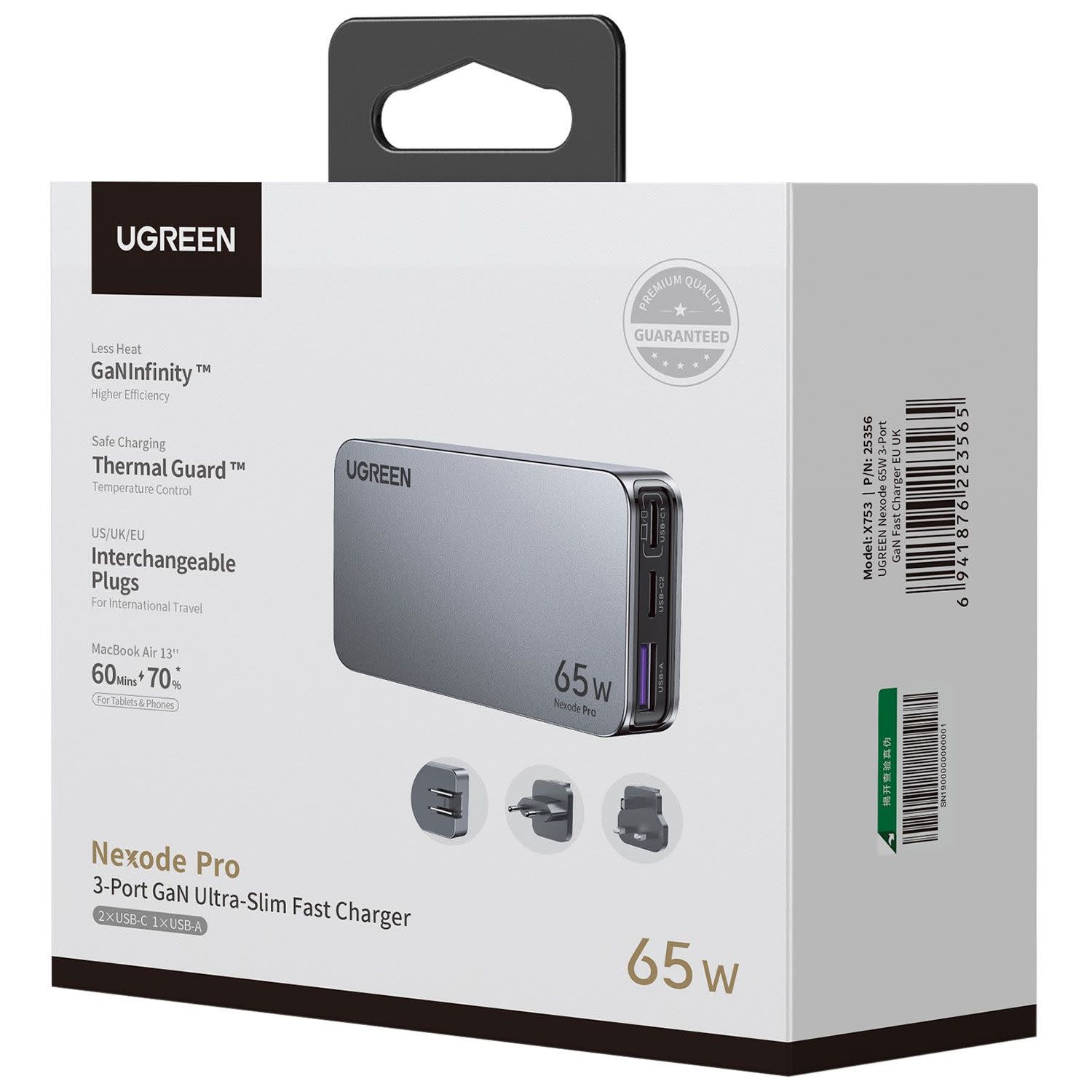 GLOBALLY READY: απόλαυσε κάθε ταξίδι χωρίς άγχος με τον εξαιρετικά λεπτό φορτιστή ταξιδίου Nexode Pro 65W 3-Port GaNτης UGREEN, ο οποίος έρχεται με εναλλάξιμους προσαρμογείς ρεύματος (US/EU/UK) για την απρόσκοπτη φόρτιση των συσκευών σου, σε όποια χώρα και αν βρίσκεσαι.