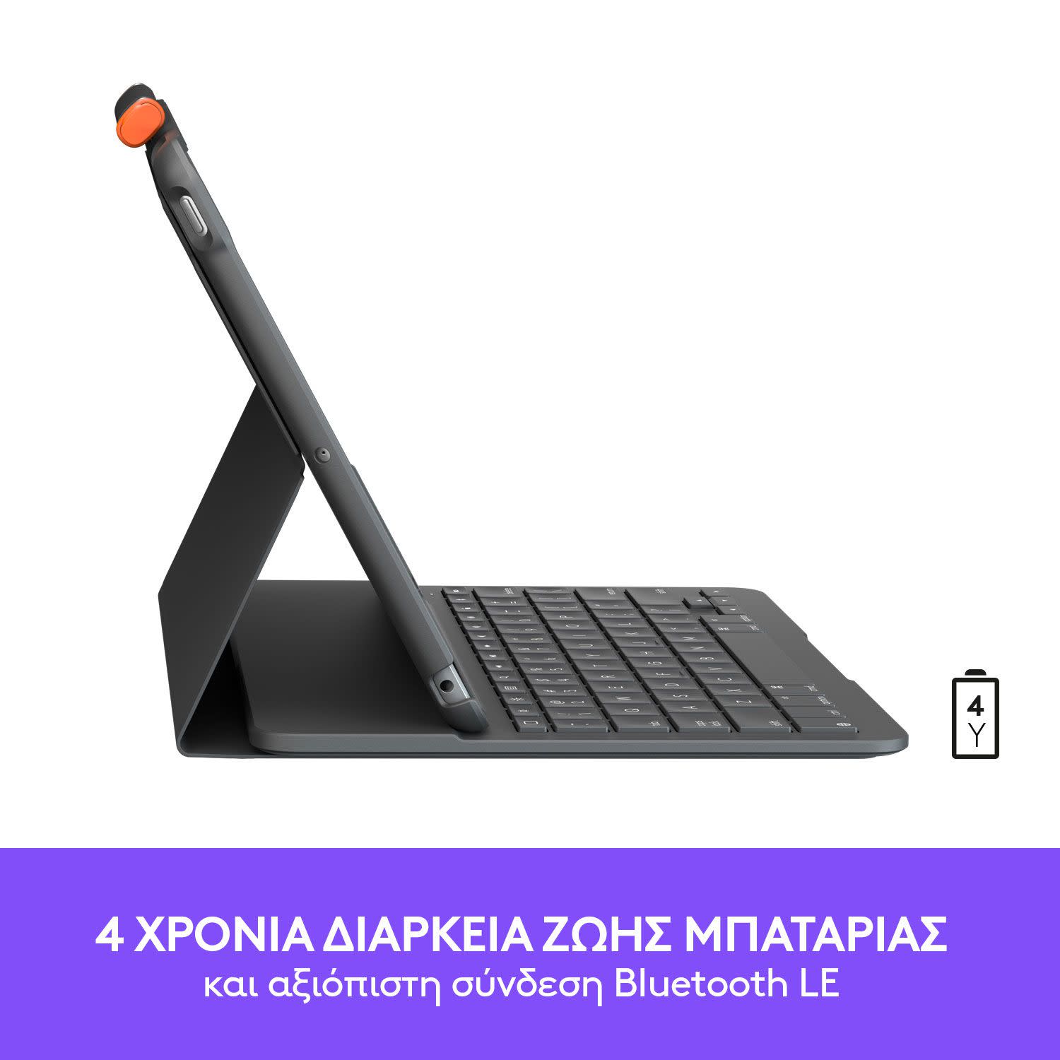Άνοιξε απλώς το έξυπνο κάλυμμα Slim Folio για να ενεργοποιήσεις το iPad και το πληκτρολόγιο. Στη συνέχεια, απλά κλείσε το για να ανασταλεί αυτόματα η λειτουργία και των δύο. Χρησιμοποιεί προηγμένη τεχνολογία ασύρματης σύνδεσης Bluetooth® χαμηλής ενέργειας για να παρέχει αξιόπιστη σύνδεση με μικρή κατανάλωση ενέργειας μεταξύ του iPad και του πληκτρολογίου χωρίς ενοχλητικές διακοπές.