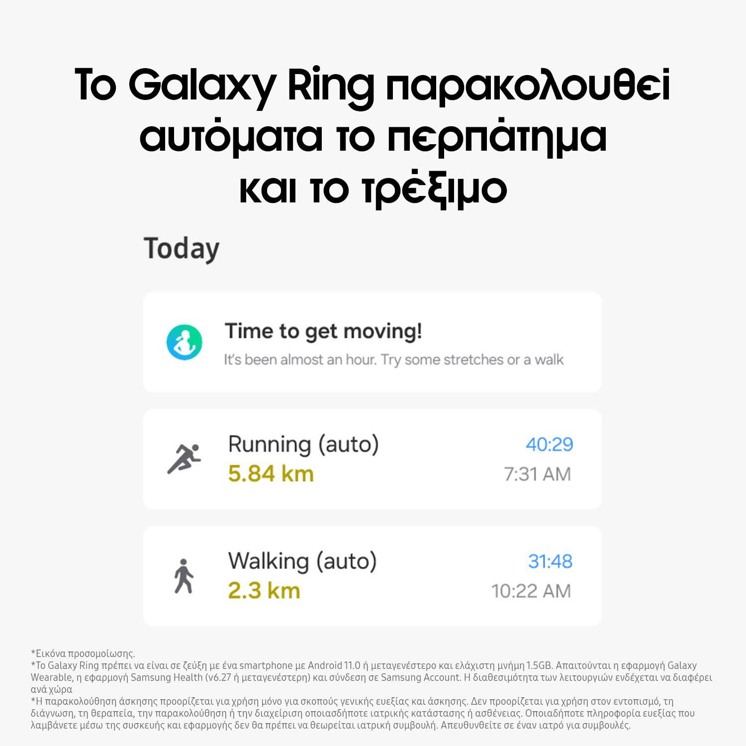 Και με διάρκεια ζωής μπαταρίας που φτάνει έως και τις 7 ημέρες, το Galaxy Ring εξασφαλίζει συνεχή παρακολούθηση χωρίς διακοπές. Διαθέσιμο σε 11 μεγέθη (με δυνατότητα χρήσης κιτ υπολογισμού μεγέθους για τέλεια εφαρμογή), το Galaxy Ring είναι το πλέον… διακριτικό και τεχνολογικά προηγμένο wearable για όσους επιθυμούν να συνδυάσουν το στιλ με την AI-powered τεχνολογία παρακολούθησης της υγείας και της ευεξίας στην καθημερινότητα τους.