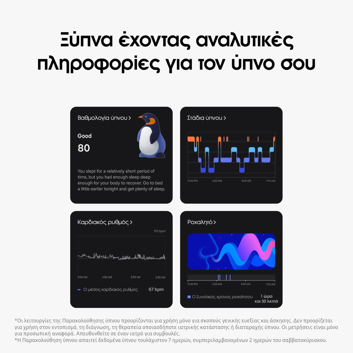 Με τρεις προηγμένους αισθητήρες, παρακολουθεί με ακρίβεια το επίπεδο δραστηριότητας και άσκησης, τα μοτίβα ύπνου, τον καρδιακό ρυθμό και τη θερμοκρασία του δέρματος παρέχοντας πολύτιμες πληροφορίες για την υγεία, την φυσική κατάσταση/ευεξία κ.ά. Η ενσωμάτωση με την ενημερωμένη εφαρμογή Samsung Health προσφέρει μια ολοκληρωμένη εμπειρία χρήσης που σου επιτρέπει να παρακολουθείς την πρόοδο σου και να επιτυγχάνεις τους στόχους σου στους τομείς της υγείας, της σωματικής κατάστασης/άσκησης, της ποιότητας ύπνου και της ενσυνειδητότητας (mindfulness).
