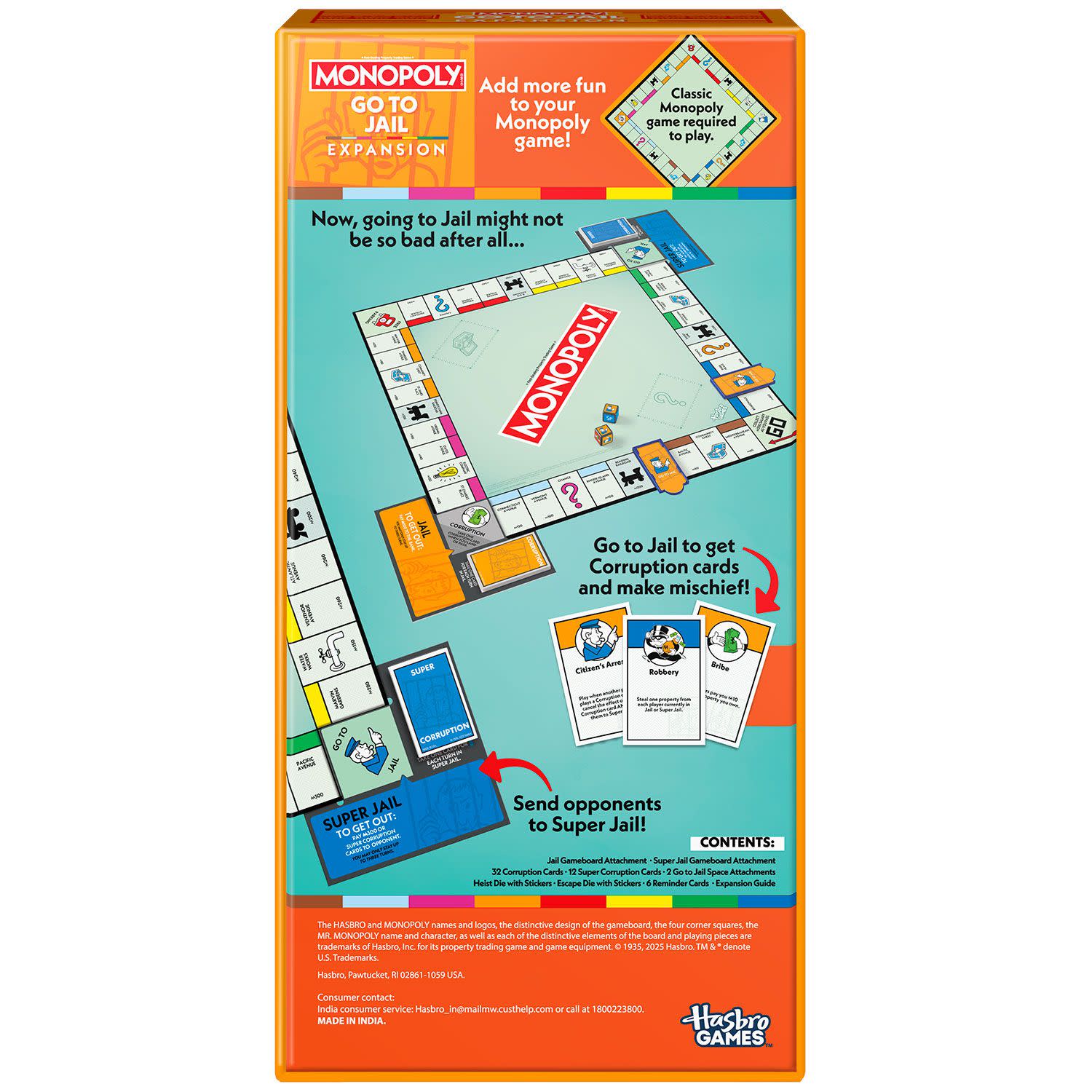 Η Επέκταση Monopoly «Go To Jail» είναι μια νέα παραλλαγή του γνωστού παιχνιδιού Monopoly και απαιτεί τον μισό χρόνο για να ολοκληρωθεί μια παρτίδα. Απλά τοποθέτησε την επέκταση στο κλασικό ταμπλό και μετάτρεψε τις θέσεις Φυλακή και Πήγαινε στη Φυλακή σε επιθυμητές θέσεις. Όσο βρίσκονται εκεί, οι παίκτες μπορούν να παίρνουν κάρτες «Διαφθοράς» ή «Υπερδιαφθοράς», που τους επιτρέπουν να ξεφεύγουν με τις κατεργαριές τους και να αποκτούν πλεονεκτήματα έναντι άλλων παικτών! Το παιχνίδι τελειώνει όταν όλες οι ιδιοκτησίες αγοραστούν ή όταν ένας παίκτης χρεοκοπήσει. Ο πλουσιότερος παίκτης κερδίζει!