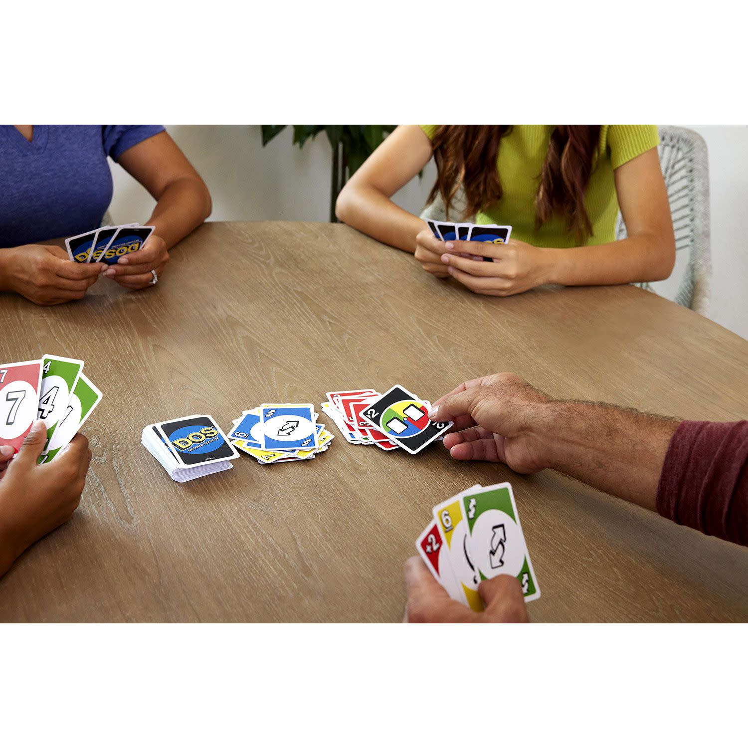 Το κλασικό παιχνίδι UNO™ τώρα έχει έναν νέο φίλο, το ανανεωμένο DOS™! Σκοπός του παιχνιδιού είναι να γίνεις ο πρώτος παίκτης που θα ξεφορτωθεί τις κάρτες του και ο πρώτος που θα συγκεντρώσει 200 βαθμούς. Όταν μείνεις με δύο κάρτες, μη ξεχάσεις να φωνάξεις "DOS!"
