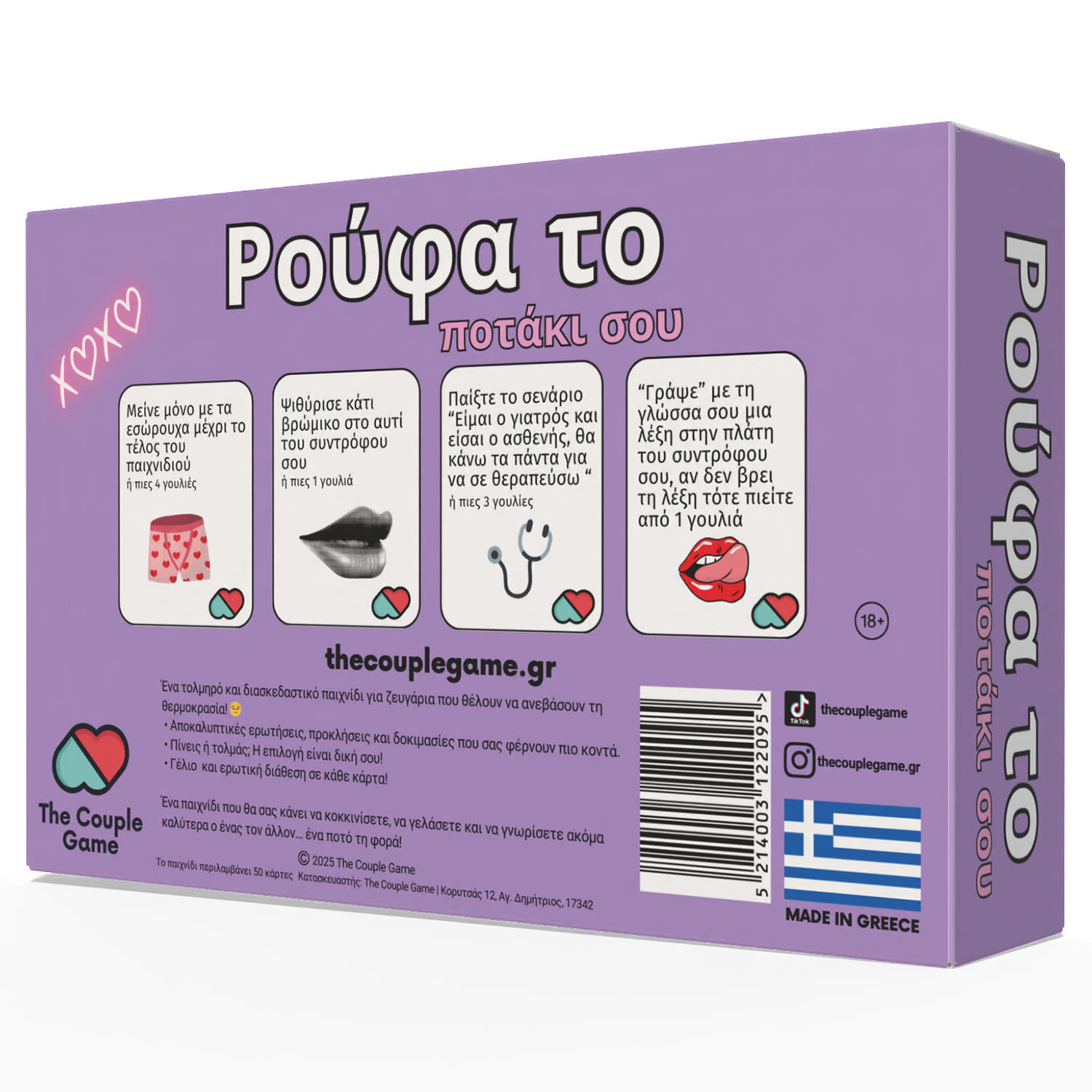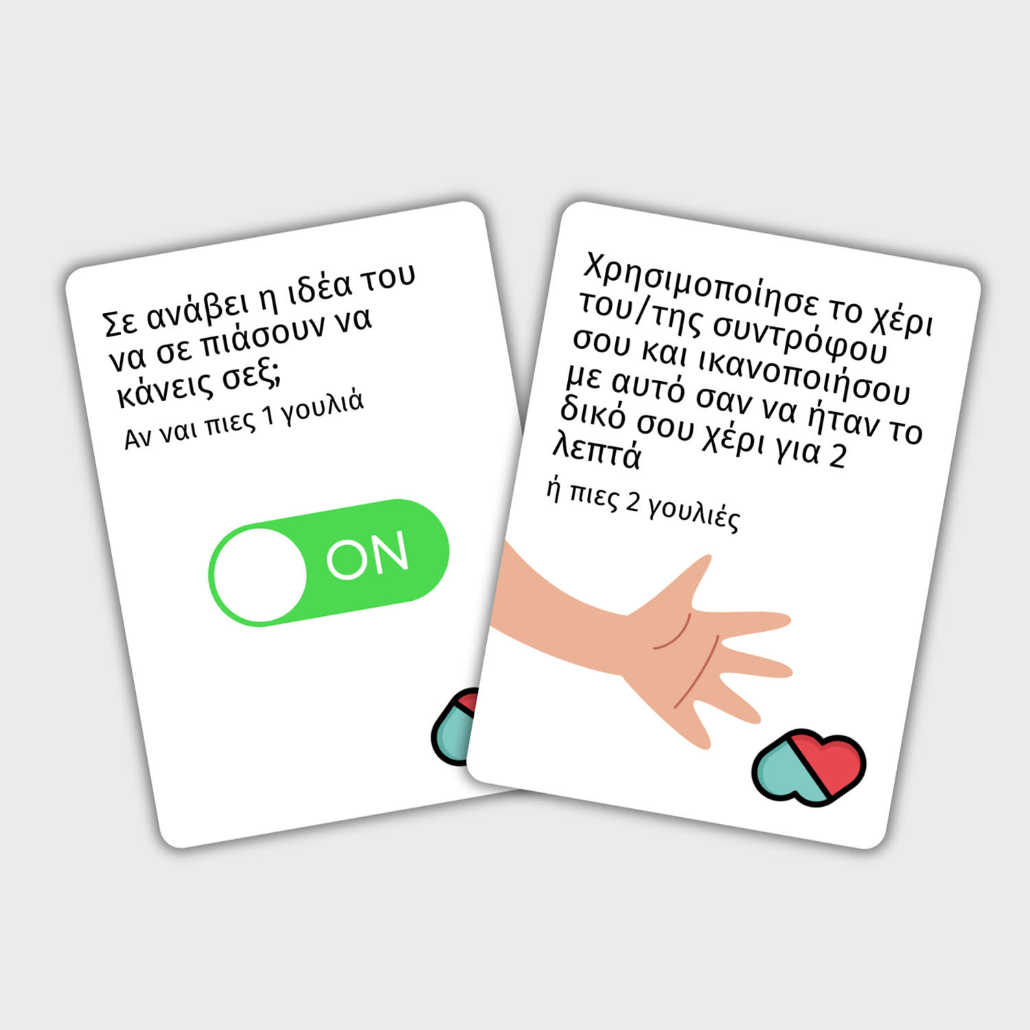 Έτοιμοι να παίξετε το πιο τολμηρό drinking game για ζευγάρια; Σήκωσε μια κάρτα και ακολούθησε τις οδηγίες. Αν δεν το κάνεις... τότε ρούφα το ποτάκι σου! Είναι παιχνιδιάρικο, είναι τολμηρό και είναι ένα παιχνίδι για ζευγάρια που θα σας μείνει σίγουρα αξέχαστο. Ετοιμαστείτε για γέλιο, πάθος και λίγη… ζάλη στις νύχτες σας!