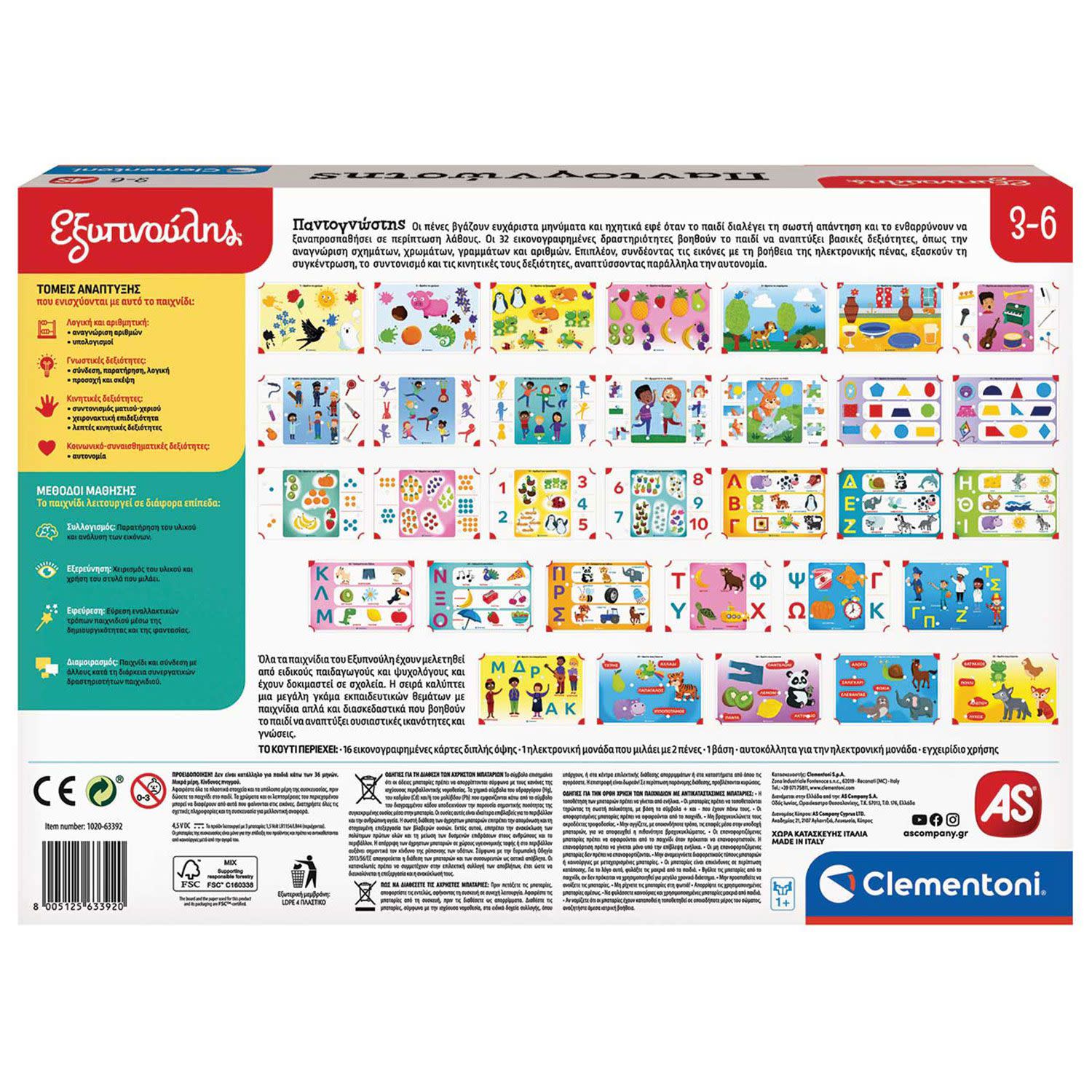 Ηλεκτρονικός Παντογνώστης που μιλάει με 2 διαδραστικές πένες! Περιλαμβάνει 32 εκπαιδευτικές δραστηριότητες και πάνω από 200 κουίζ γύρω από ποικίλα θέματα! Μέσα από το παιχνίδι, το παιδί θα συναντήσει χαριτωμένους χαρακτήρες, αγαπημένα ζώα και οικεία αντικείμενα και θα αρχίσει να αναγνωρίζει χρώματα, σχήματα, γράμματα και πολλά περισσότερα! Οι πένες βγάζουν ευχάριστα μηνύματα και ηχητικά εφέ όταν το παιδί διαλέγει τη σωστή απάντηση και το ενθαρρύνουν να προσπαθήσει ξανά σε περίπτωση λάθους.