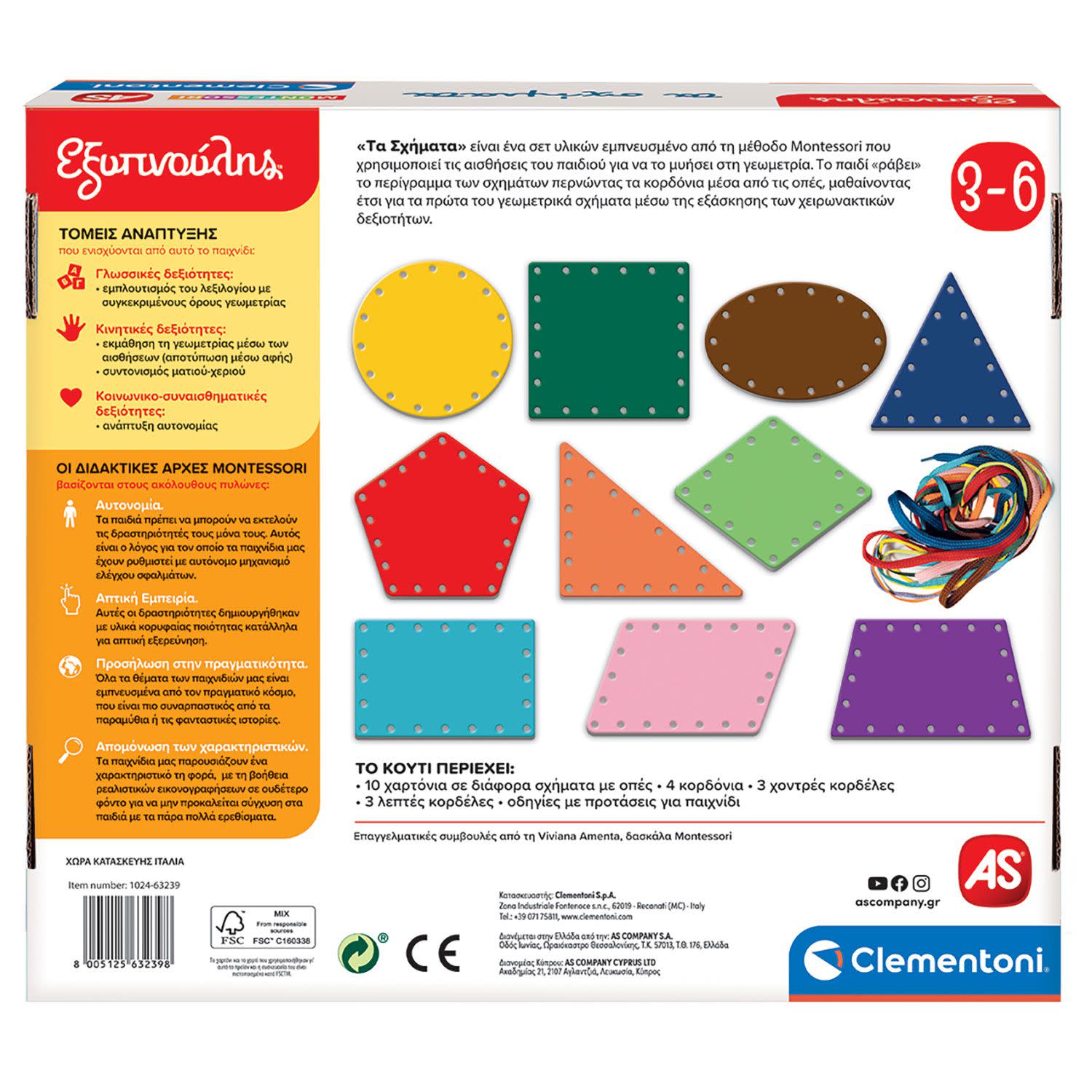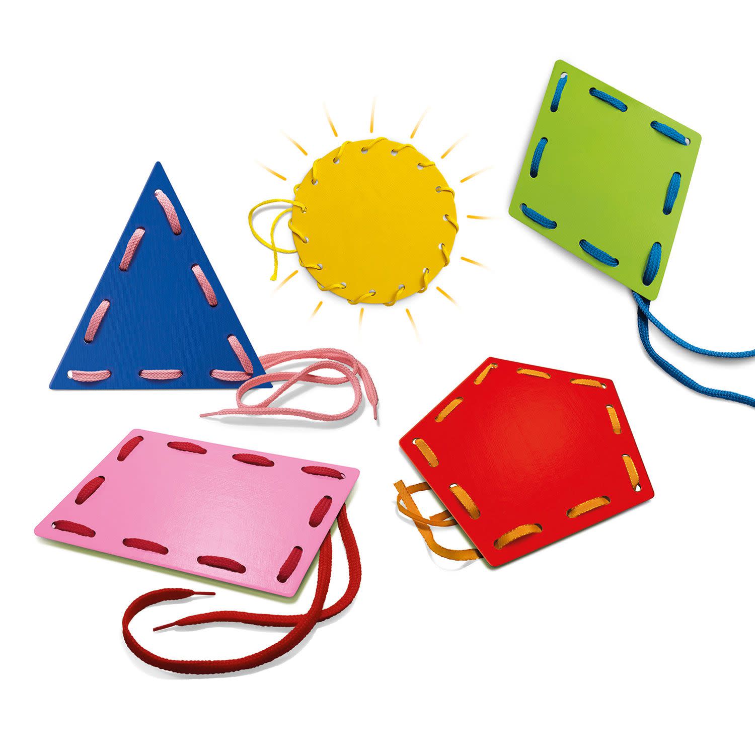 Τα Σχήματα είναι ένα σετ υλικών εμπνευσμένο από τη μέθοδο Montessori που χρησιμοποιεί τις αισθήσεις του παιδιού για να το μυήσει στη γεωμετρία. Το παιδί «ράβει» το περίγραμμα των σχημάτων περνώντας τα κορδόνια μέσα από τις οπές, μαθαίνοντας έτσι για τα πρώτα του γεωμετρικά σχήματα μέσω της εξάσκησης των χειρωνακτικών δεξιοτήτων.