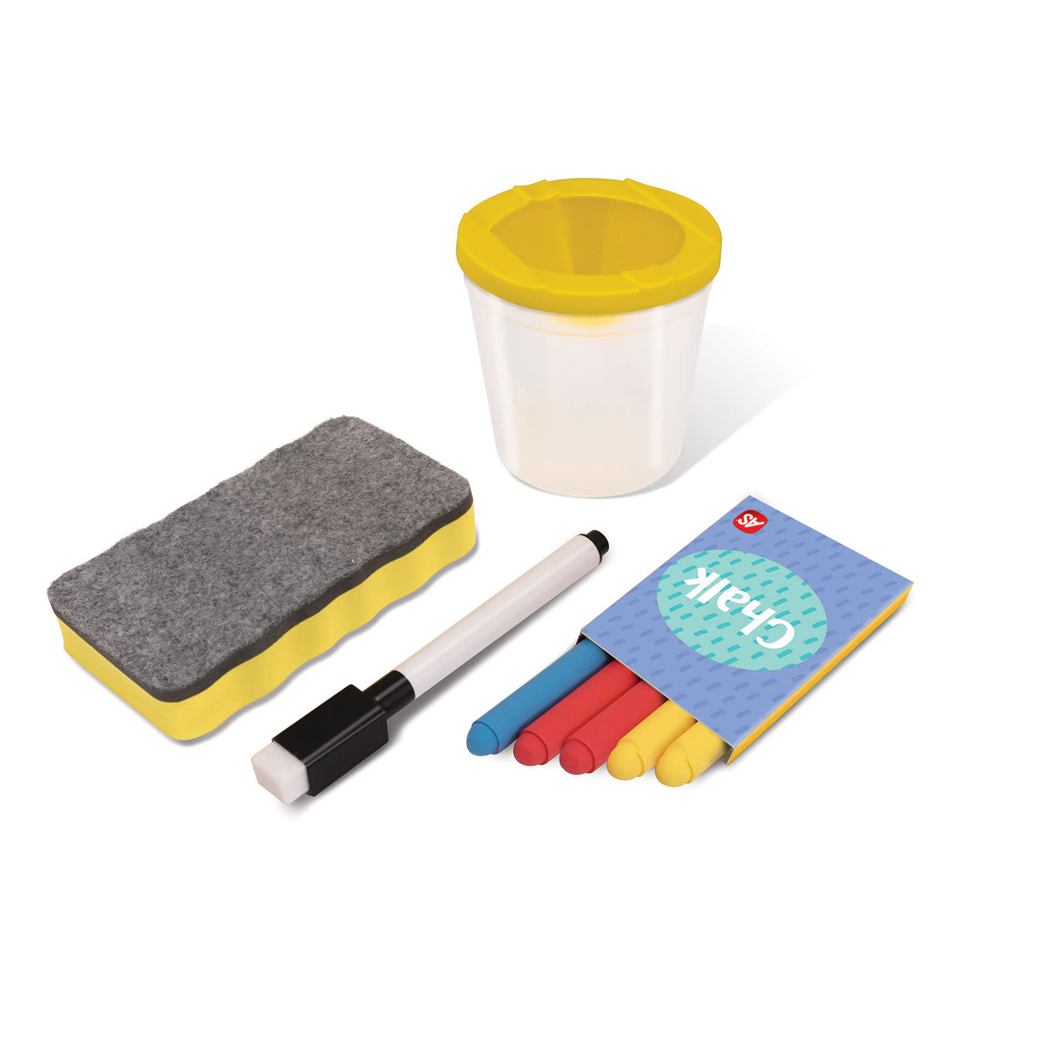 Περιλαμβάνεται: - 5 κιμωλίες - 1 μαρκαδόρος - 1 σφουγγαράκι - 1 ξύλινο ράφι - 28 μαγνήτες - 1 πίνακας δραστηριοτήτων - 1 δοχείο αποθήκευσης χρωμάτων