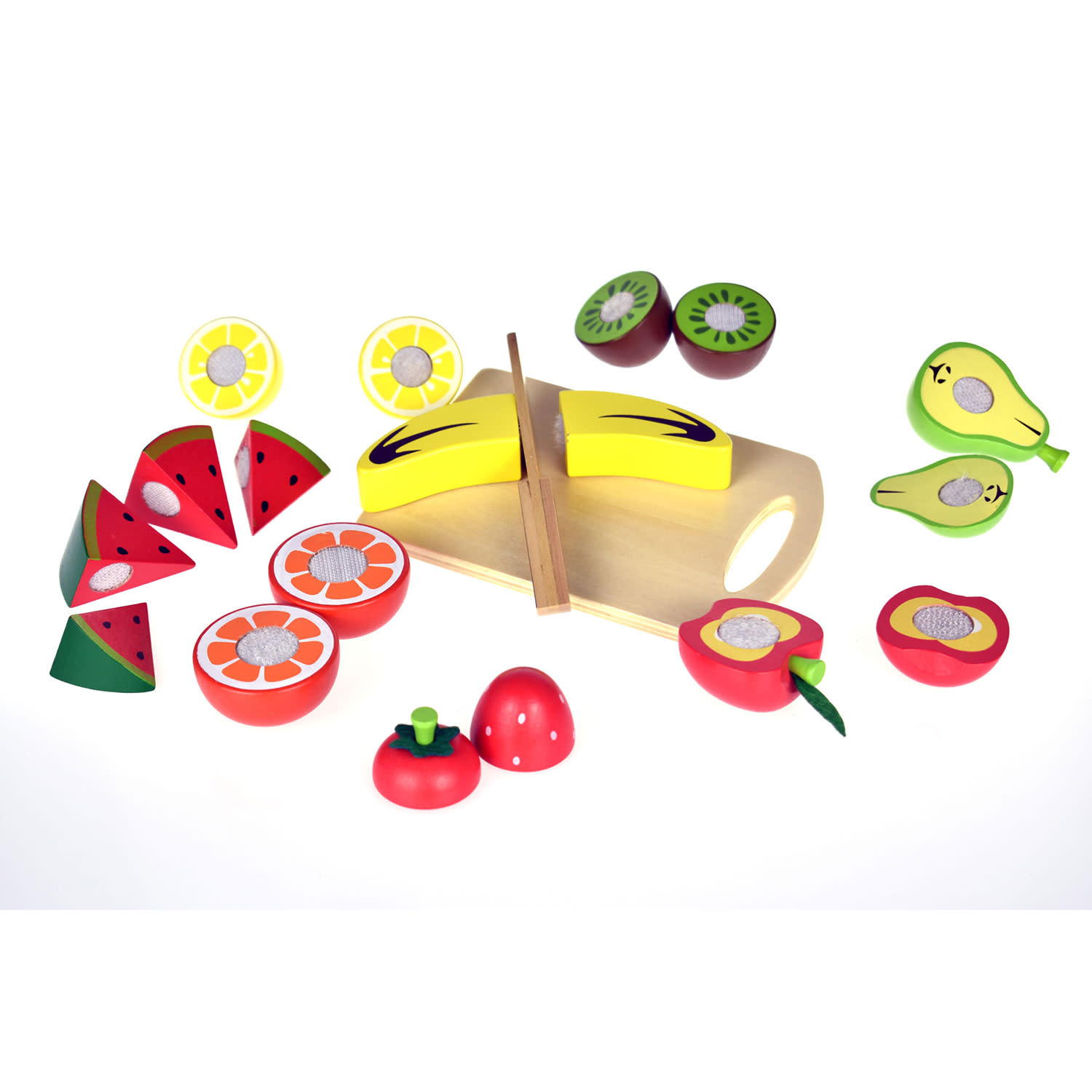 Με έντονα χρώματα και όμορφα σχέδια, το ξύλινο σετ φρούτων κοπής βοηθάει το παιδί να εξοικειωθεί με τα φρούτα, τα σχήματα και τα χρώματα και να αναπτύξει καλύτερο συντονισμό κινήσεων. Συμπεριλαμβάνεται και ξύλο κοπής και δίσκος για την τοποθέτηση των φρούτων.