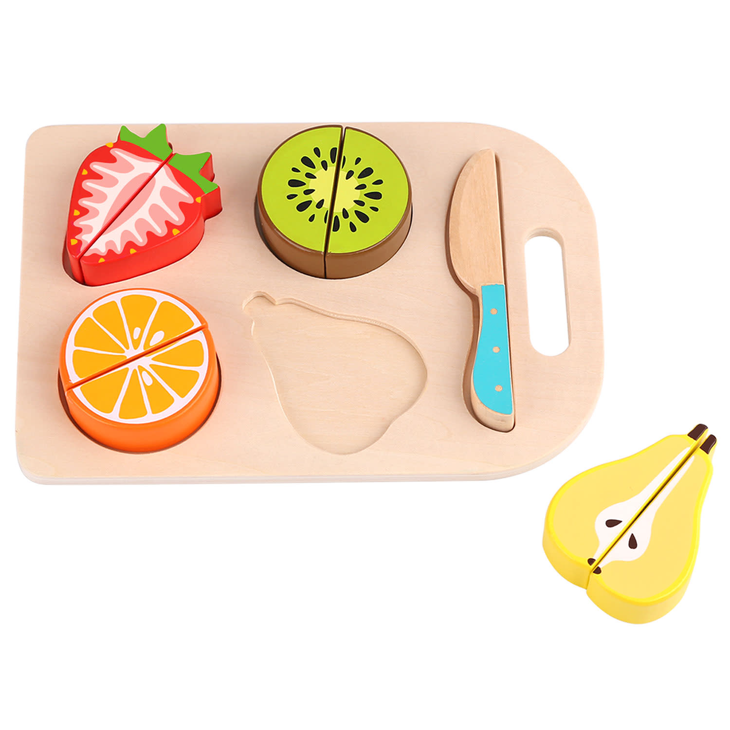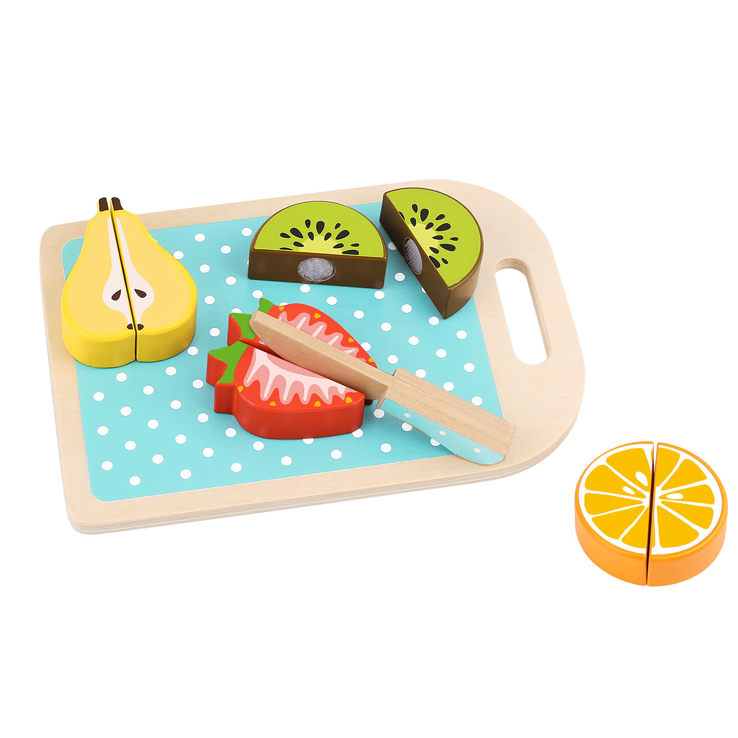 Ο μικρός μας σεφ θα δημιουργήσει γευστικά πιάτα από φρούτα. Χρησιμοποιώντας ένα ξύλο κοπής και ένα ξύλινο μαχαιράκι, μπορεί εύκολα και γρήγορα να κόψει πορτοκάλια, φράουλες, αχλάδια και ακτινίδια και να τα προσφέρει στους φίλους του, μαθαίνοντας έτσι την έννοια του μισού και του ολόκληρου! Έτσι, η μάθηση γίνεται παιχνίδι!