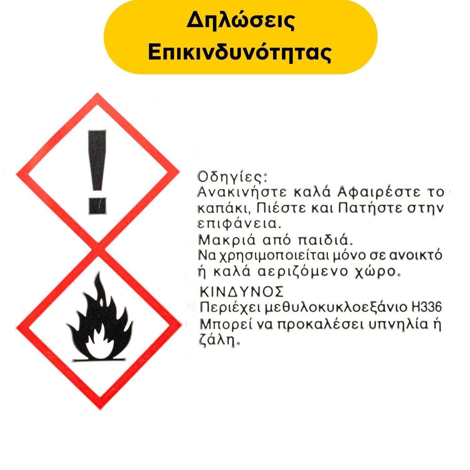 Υγρό και ατμοί πολύ εύφλεκτα. Προκαλεί ερεθισμό του δέρματος. Μπορεί να προκαλέσει υπνηλία ή ζάλη. Επιβλαβές για τους υδρόβιους οργανισμούς, με μακροχρόνιες επιπτώσεις.