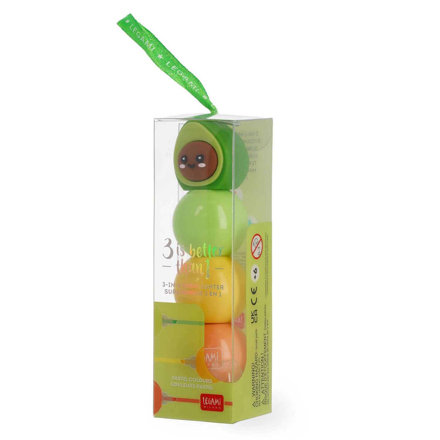 Μαρκαδόρος υπογράμμισης 3σε1 με σχέδιο Avocado από τη Legami. Ξεδίπλωσε τη δημιουργικότητά σου με 3 παστέλ χρώματα και στοίβαξέ τα για να σχηματίσεις το πιο χαριτωμένο αβοκάντο.