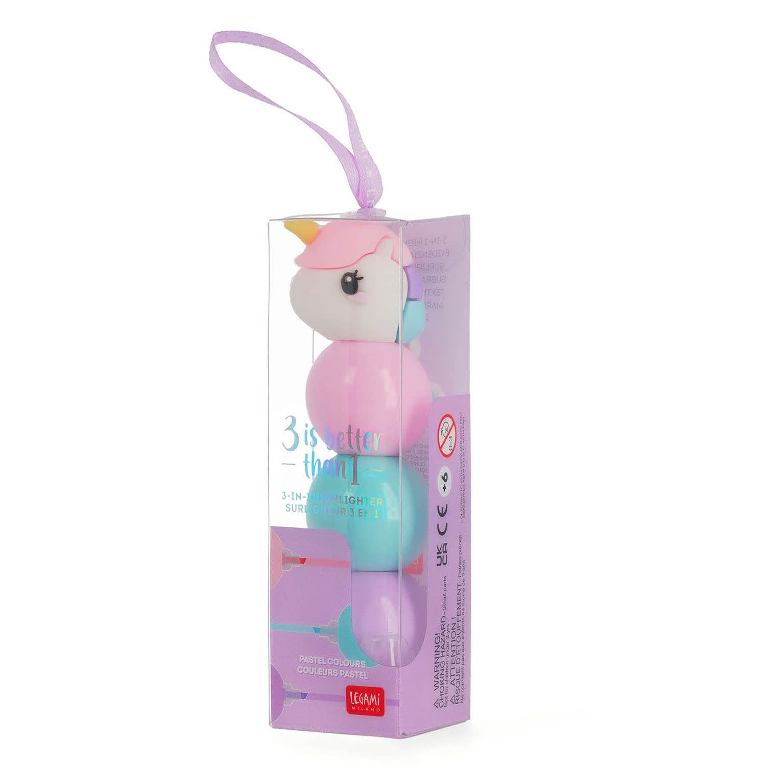 Μαρκαδόρος υπογράμμισης 3σε1 με σχέδιο Unicorn από τη Legami. Ξεδίπλωσε τη δημιουργικότητά σου με 3 παστέλ χρώματα και στοίβαξέ τα για να σχηματίσεις τον πιο χαριτωμένο μονόκερο.