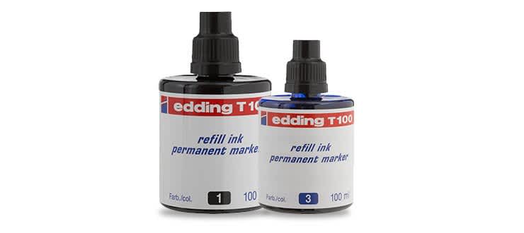 Ανεξίτηλα μελάνια ουδέτερης οσμής σε μπουκάλια με σύστημα χοάνης για γέμισμα μαρκαδόρων διαρκείας. Σε 2 χρώματα: μαύρο και μπλέ. Γεμίζε τον Edding 2000 ή οποιοδήποτε άλλο επαναγεμιζόμενο μαρκαδόρο 100ml.