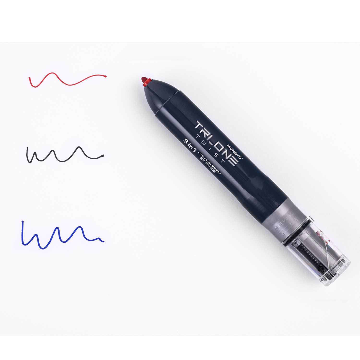 Μαρκαδόρος ανεξίτηλος τριών χρωμάτων με μπλε, μαύρο και κόκκινο μελάνι σε ένα! Η μύτη του είναι στρογγυλή, με διάμετρο 1.0-2.0mm. και είναι κατάλληλος για όλες σχεδόν τις επιφάνειες όπως χαρτί, πλαστικό και μέταλλο. Στεγνώνει γρήγορα, είναι ανθεκτικός στο νερό και δεν ξεθωριάζει.