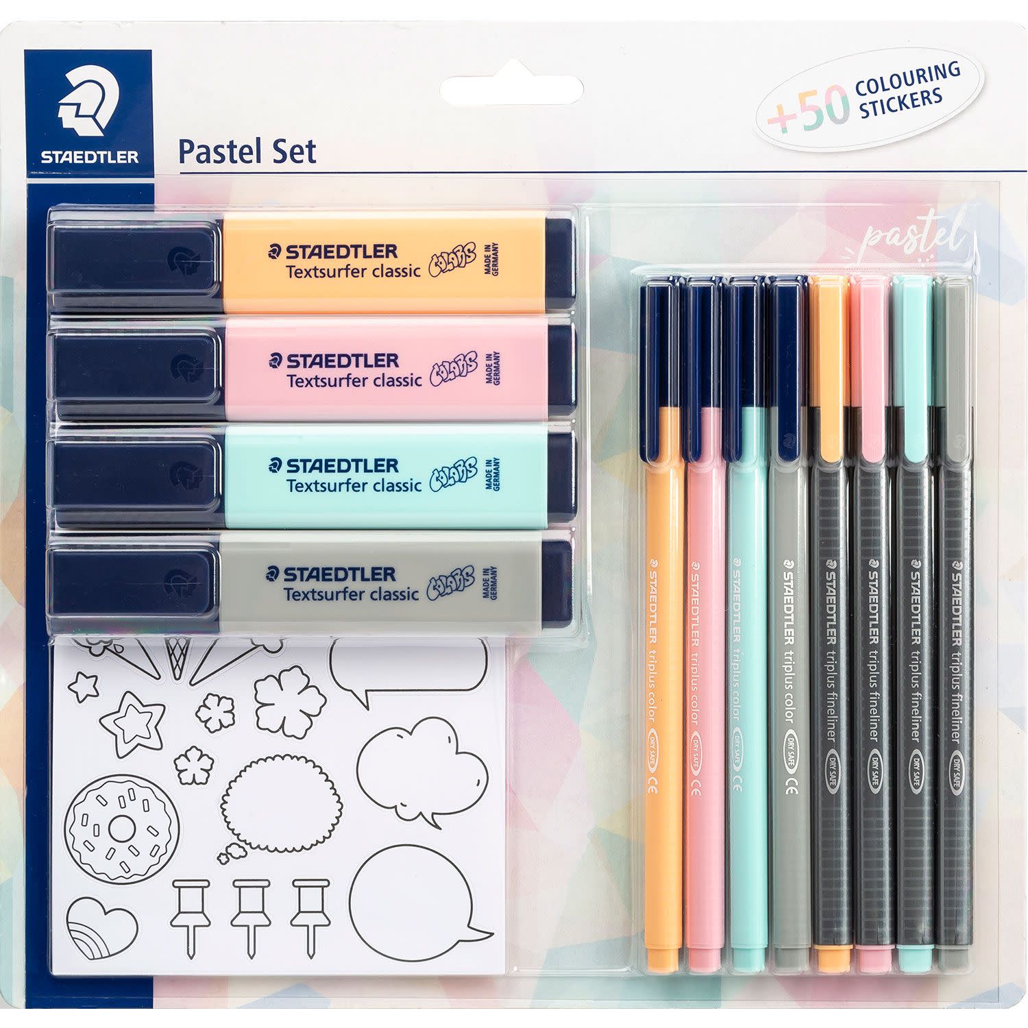 Το απολυτο pastel set από τη Staedtler. Περιέχει 4 μαρκαδόρους υπογράμμισης, 4 μαρκαδόρους ψιλής γραφής 0.3mm, 4 μαρκαδόρους 1.0mm και 50 αυτοκόλλητα έτοιμα να τα χρωματίσεις!