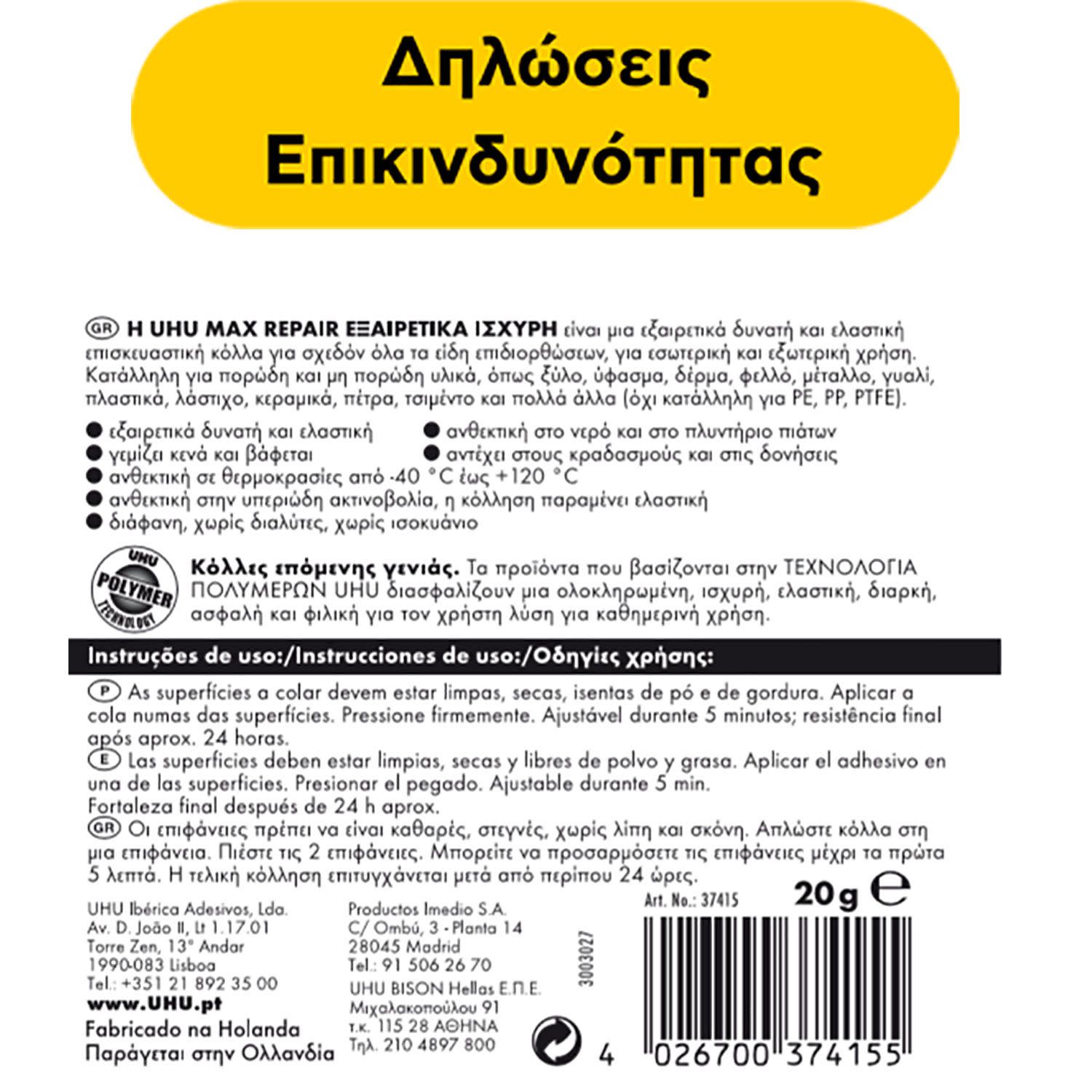 Η κόλλα Max Repair, με διάφανη εφαρμογή, είναι εξαιρετικά ισχυρή και κατάλληλη για όλες τις επισκευές και σχεδόν για όλα τα υλικά, πορώδη και μη πορώδη. Είναι μόνιμα ελαστική, ανθεκτική στο νερό ακόμα και στο πλυντήριο πιάτων. Επιπλέον, γεμίζει κενά, βάφεται και αντέχει σε κραδασμούς. Είναι ανθεκτική στην UV ακτινοβολία και αντέχει θερμοκρασίες από -40 °C έως 120 °C.