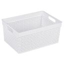 Καλάθι αποθήκευσης με χερούλια σε λευκό χρώμα και μοντέρνο σχεδιασμό. Είναι κατασκευασμένο από πλαστικό υλικό. Ιδανικό για το γραφείο ή οποιοδήποτε άλλο χώρο του σπιτιού χρειάζεται τακτοποίηση.
