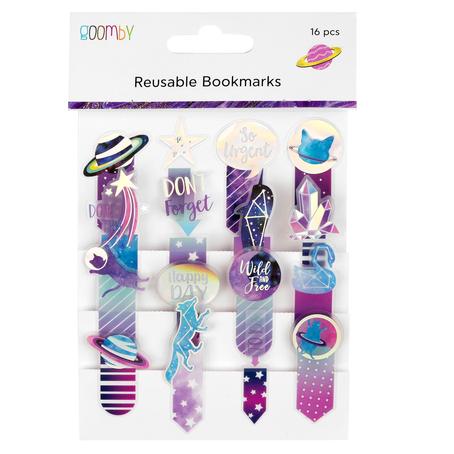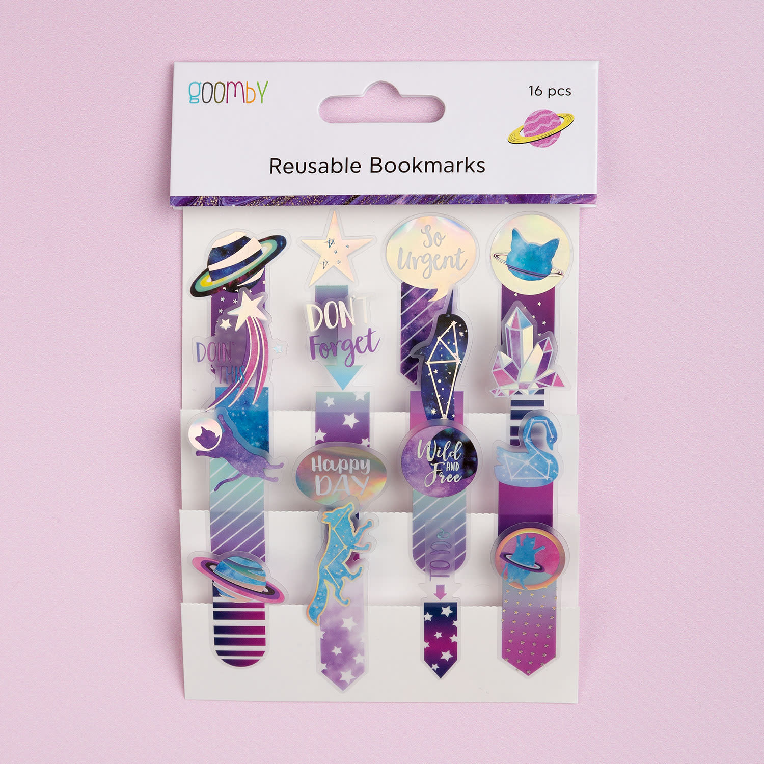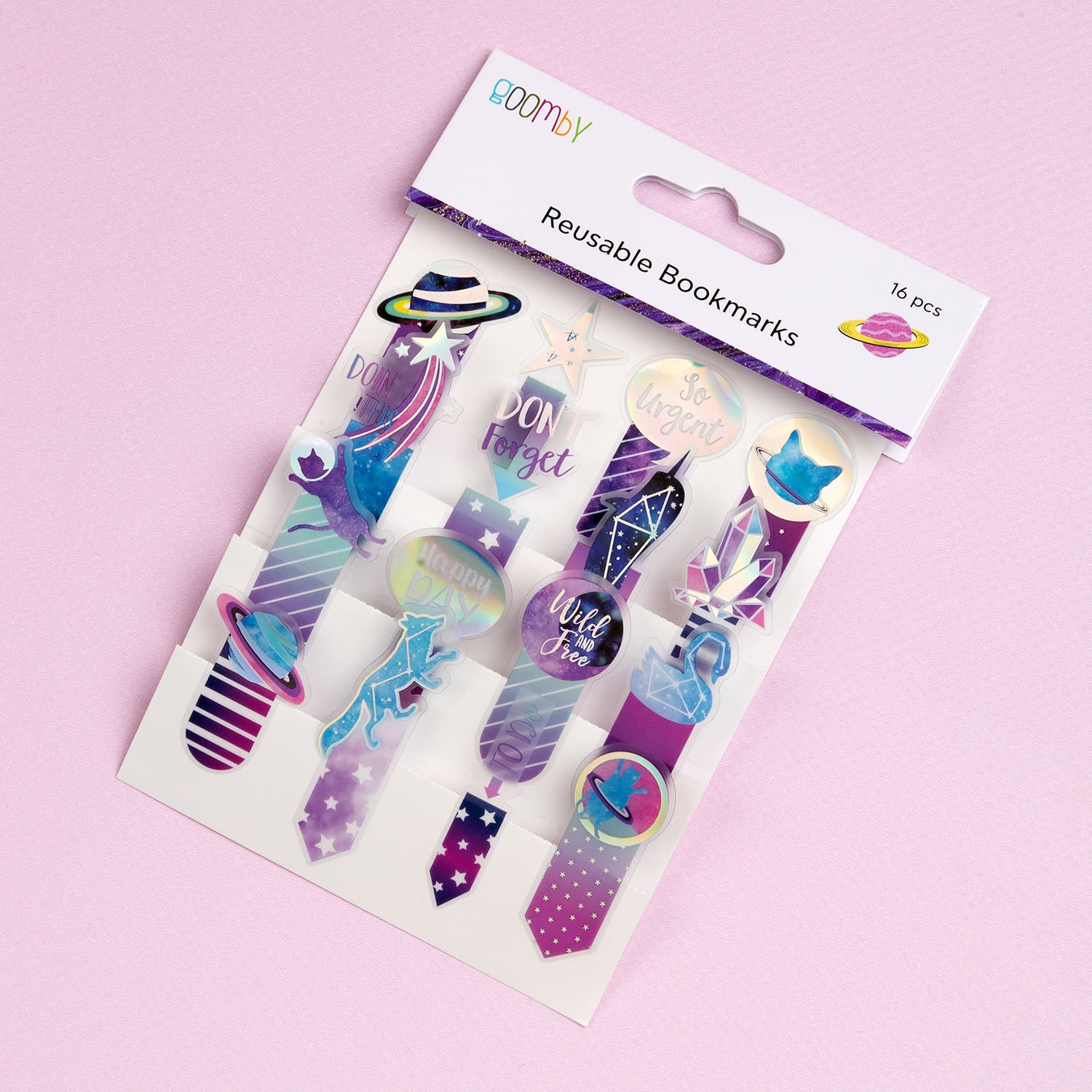 Αυτοκόλλητοι επανατοποθετούμενοι σελιδοδείκτες Holographic από τη Goomby. Είναι το ιδανικό αξεσουάρ των μαθητών, ώστε να σημαδεύουν τη σελίδα της παράδοσης του μαθήματος, τις ασκήσεις που έχουν για το σπίτι ή τα sos θέματα για τις εξετάσεις. Διαθέτουν 12 διαφορετικά, μοναδικά σχέδια.