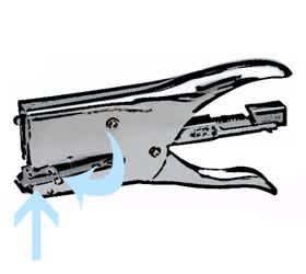 Η ρύθμισή της προσωρινής συρραφής είναι απλή. Στο κάτω μέρος του συρραπτικού θα δείτε μία ειδική εσοχή την οποία μπορείτε να πιέσετε προς τα μέσα. Με την πίεση η "κεφαλή" του συρραπτικού ξεκλειδώνει και μπορείτε να την περιστρέψετε 180 μοίρες. Τώρα είναι σε θέση προσωρινής συρραφής.