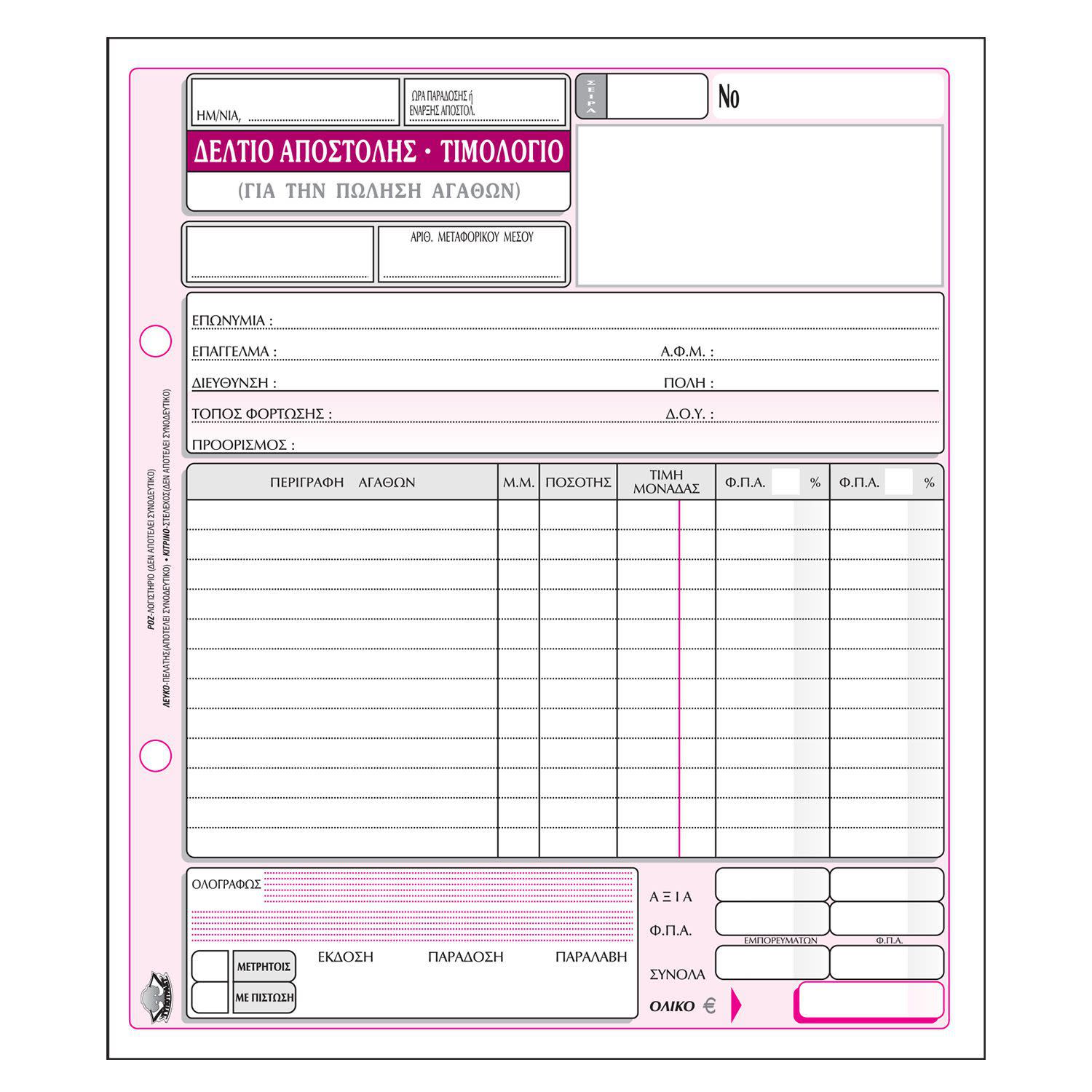 Απαραίτητο λογιστικό έντυπο για την αποστολή και πώληση προϊόντων με δύο στήλες ΦΠΑ. Αυτογραφικό έντυπο που δεν χρειάζεται καρμπόν. Διαθέτει 50 φύλλα. Το χαρτόνι που υπάρχει πίσω από το εξώφυλλο σκίζεται και τοποθετείται ανάμεσα στα φύλλα για να μην αποτυπώνονται τα γράμματα στα υπόλοιπα φύλλα.