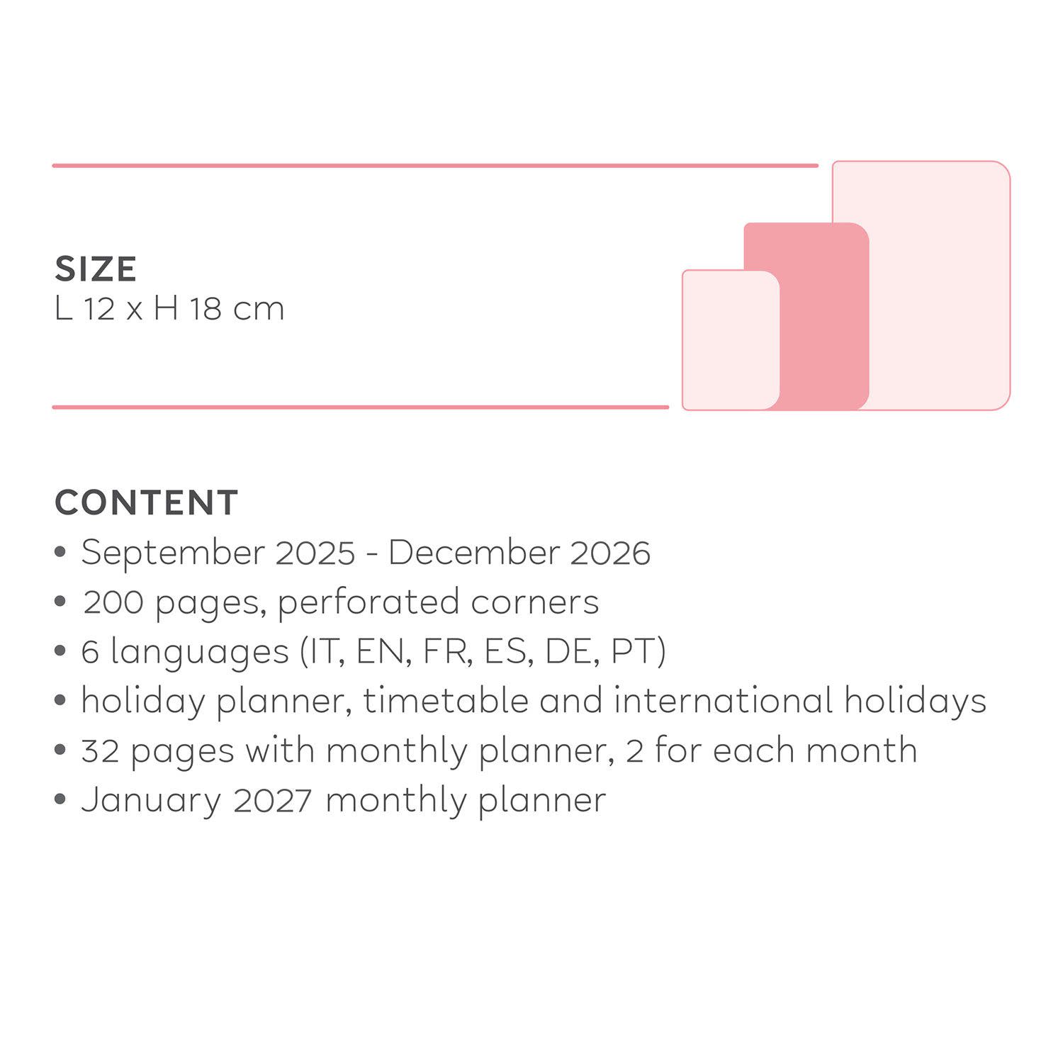 Εάν το Σαββατοκύριακο φαίνεται πάντα πολύ μακριά, το Εβδομαδιαίο Ακαδημαϊκό Ημερολόγιο 2025-2026 «Future Dusk» από τη Legami είναι ο ιδανικός σύμμαχος, αφού κάθε φορά που γυρίζεις σελίδα, το… επόμενο ΣΚ σε περιμένει στην γωνία! Ξεκινώντας από τον Σεπτέμβριο του 2025 έως τον Δεκέμβριο του 2026 σε βοηθάει να βάζεις τάξη και να κάνεις highlight όλες τις σημαντικές στιγμές. Έρχεται με άφθονο χώρο για καθημερινές σημειώσεις, συναντήσεις και εκκρεμότητες, που οργανώνονται από τις 7 π.μ. έως τις 9 μ.μ. Επιπλέον, σου δείχνει τις διεθνείς αργίες, καθώς και ένα βολικό χρονοδιάγραμμα. Τέλος, διαθέτει κλείσιμο με λάστιχο και πίσω τσέπη, για εύχρηστη αποθήκευση εγγράφων.