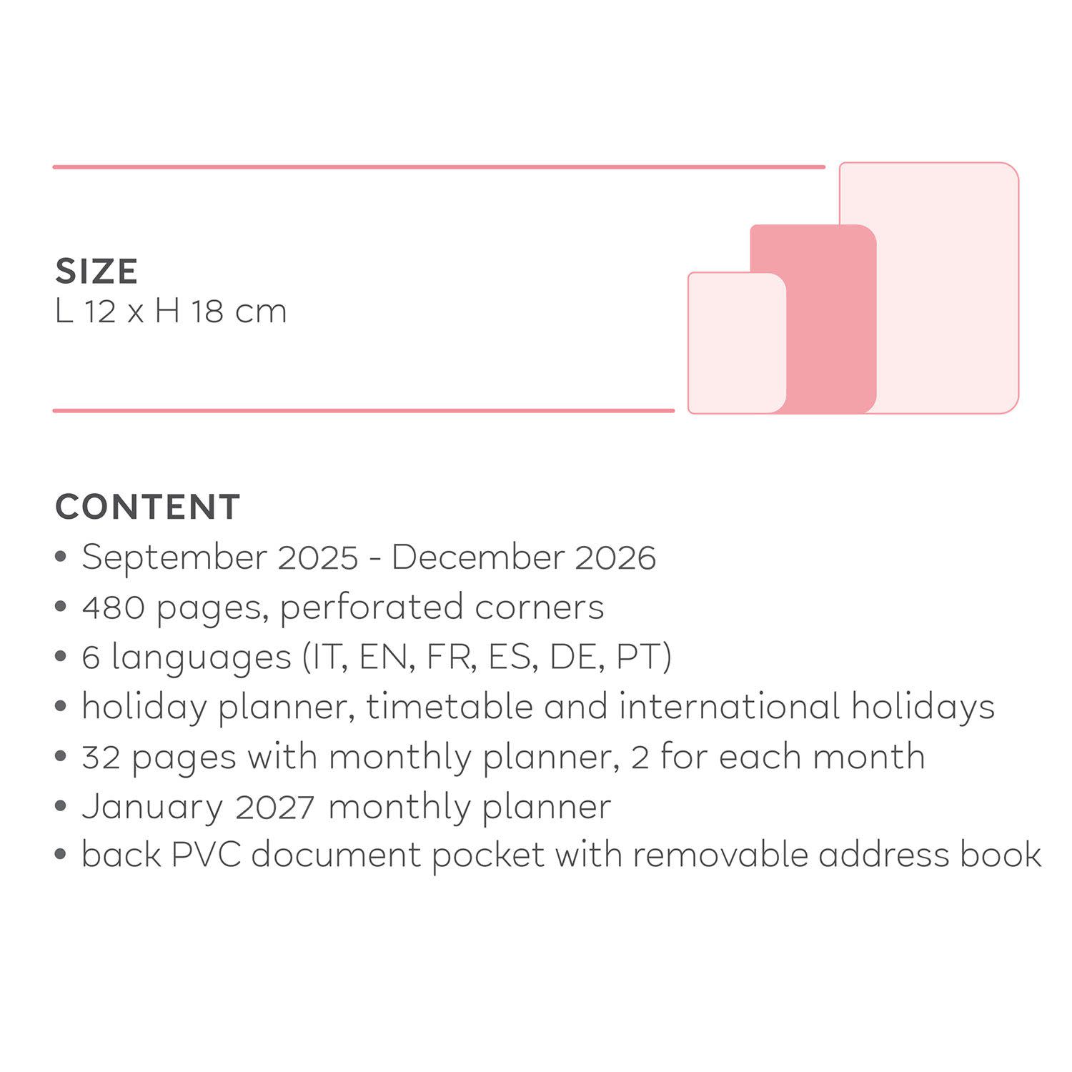 Υπάρχει επίσης ένα χρήσιμο planner διακοπών, ένα planner διπλής σελίδας για κάθε μήνα, συμπεριλαμβανομένου του Ιανουαρίου 2026, και διάτρητες γωνίες που μπορείς να κόβεις στο τέλος κάθε ημέρας, ώστε να διευκολύνεις την εύρεση της σημερινής ημερομηνίας. Τέλος, διαθέτει κλείσιμο με λάστιχο και πίσω τσέπη, για εύχρηστη αποθήκευση εγγράφων.