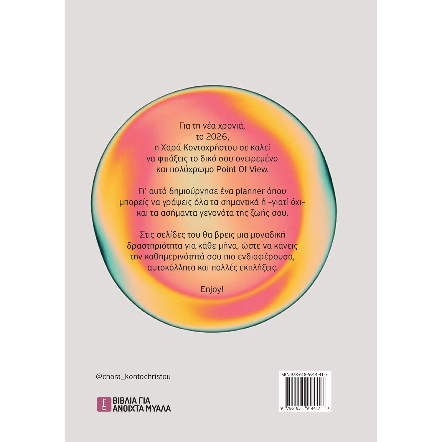 Για τη νέα χρονιά, το 2026,η Χαρά Κοντοχρήστου σε καλεί να φτιάξεις το δικό σου ονειρεµένο και πολύχρωµο Point Of View. Γι’ αυτό δηµιούργησε ένα planner όπου µπορείς να γράψεις όλα τα σηµαντικά ή –γιατί όχι– και τα ασήµαντα γεγονότα της ζωής σου. Στις σελίδες του θα βρεις µια µοναδική δραστηριότητα για κάθε µήνα, ώστε να κάνεις την καθηµερινότητά σου πιο ενδιαφέρουσα, αυτοκόλλητα και πολλές εκπλήξεις. Enjoy!