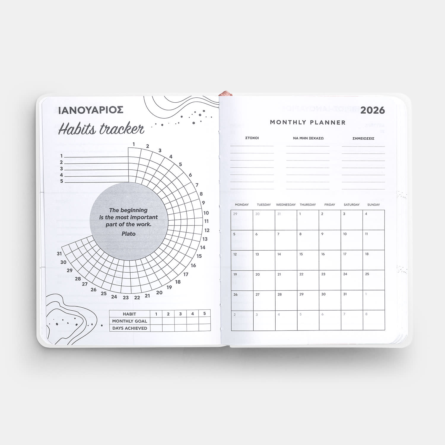 Αυτό το ακαδημαϊκό ημερολόγιο δεν είναι μόνο για να καταγράφεις τα «to-do» σου! Στην αρχή κάθε μήνα διαθέτει Habit Tracker, για να κάνεις focus στους στόχους σου και special quotes!